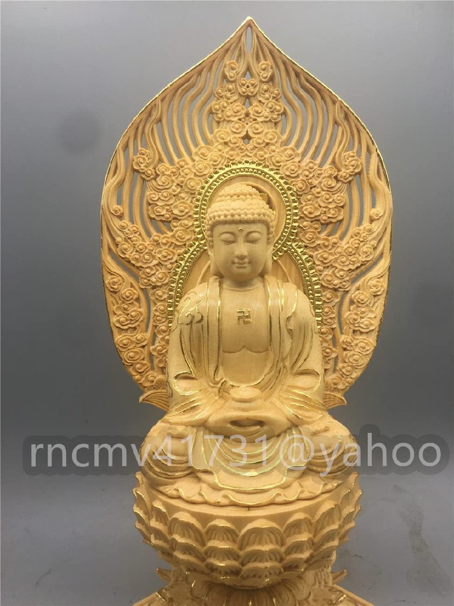「81SHOP」仏像 釈迦如来 座像仏壇仏像 木彫り本尊 お釈迦様 座釈迦祈る 厄除け 祥雲光背 八角台座高さ約28cm