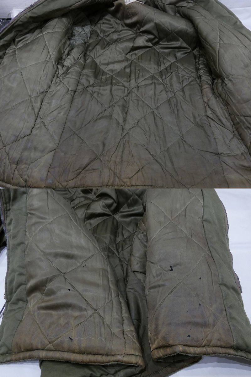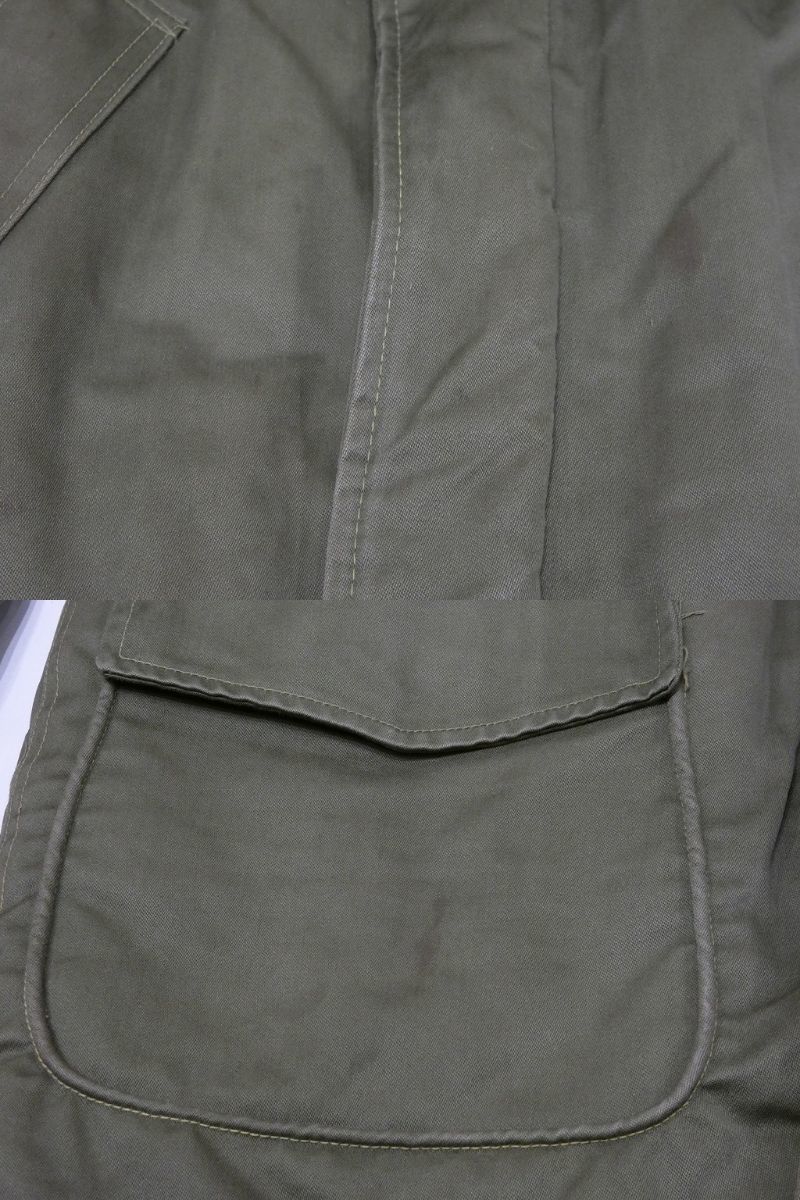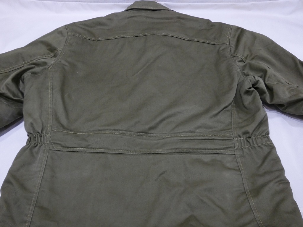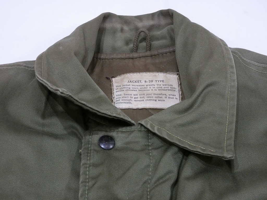 | こちらは、40〜50年代頃のUSエアフォース B-29 フライト ジャケットになります。 USAAFのB-9やB-11の様なデザインで、ジップはクラウンのスプリングジッパーが使用されています。B-29 TYPEと記載はありますが、ミルスペック等は無く恐らくはPXやサープラスショップ等で売られていた民生品かと思われます。以前にこちらと同デザインの物で、左袖にUS AIR FORCEのステンシルの入っている物を見たことがありますので、B-15などと同様に多くのメーカーがシビリアンタイプの物を作り、パイロットがプライベートパーチェスで購入していたのだと思います。この手のミリタリーアイテムはアメリカ本国でも価格が上昇中です。変わった物をお探しだった方は是非、ご検討下さい。 コンディションはやや使用感があり、スナップボタンに少しサビ、腹部や袖などにシミや薄ヨゴレが見られ、ライナーキルティングの裾の方にスレによるダメージやフェードもありますが、着用に問題なく、ビンテージのアジとして楽しんで頂ければと思います。 素材 COTTON×RAYON SIZE 肩幅51cm 身幅64cm 袖丈63cm 着丈79cm 素人採寸の為、多少の誤差はご了承ください。 | |||
