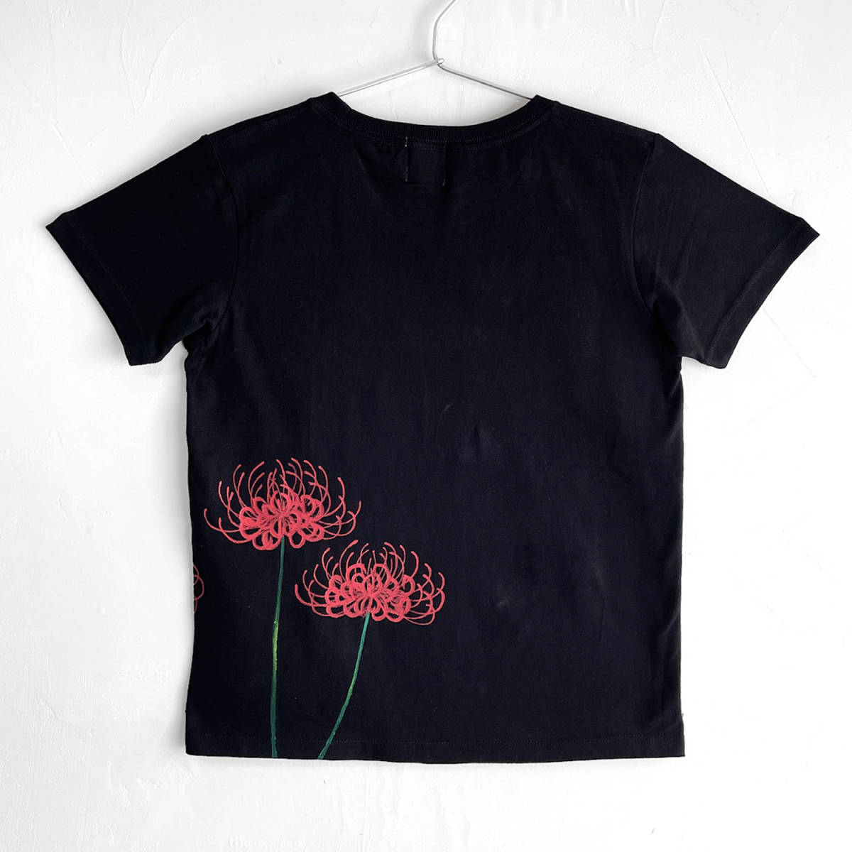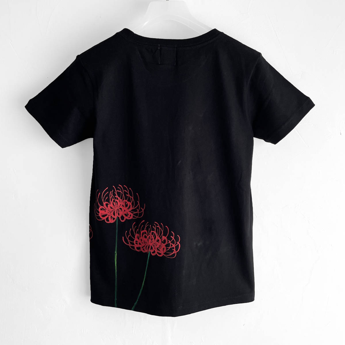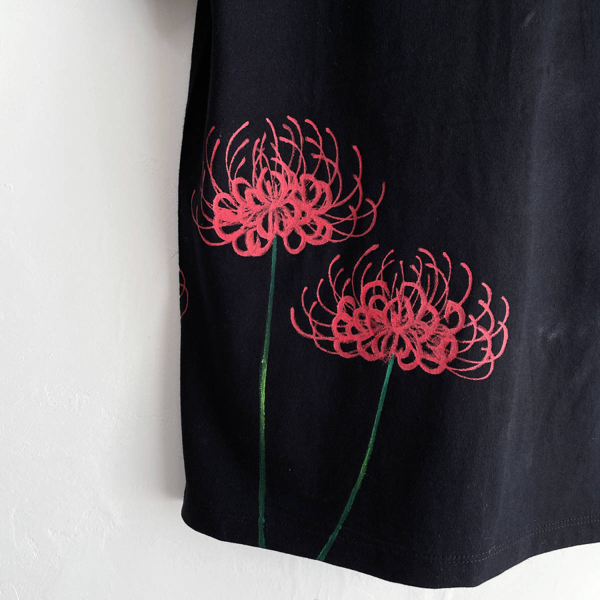 ハンドメイド 手描きTシャツ レディース Tシャツ彼岸花柄Tシャツ 手描きで描いたの彼岸花模様のTシャツ ブラック | |||
