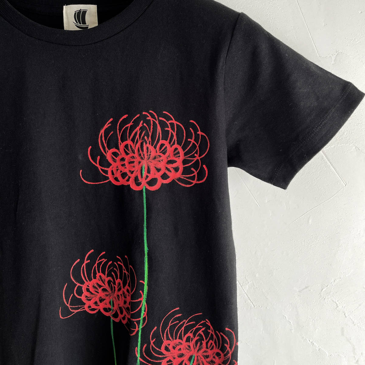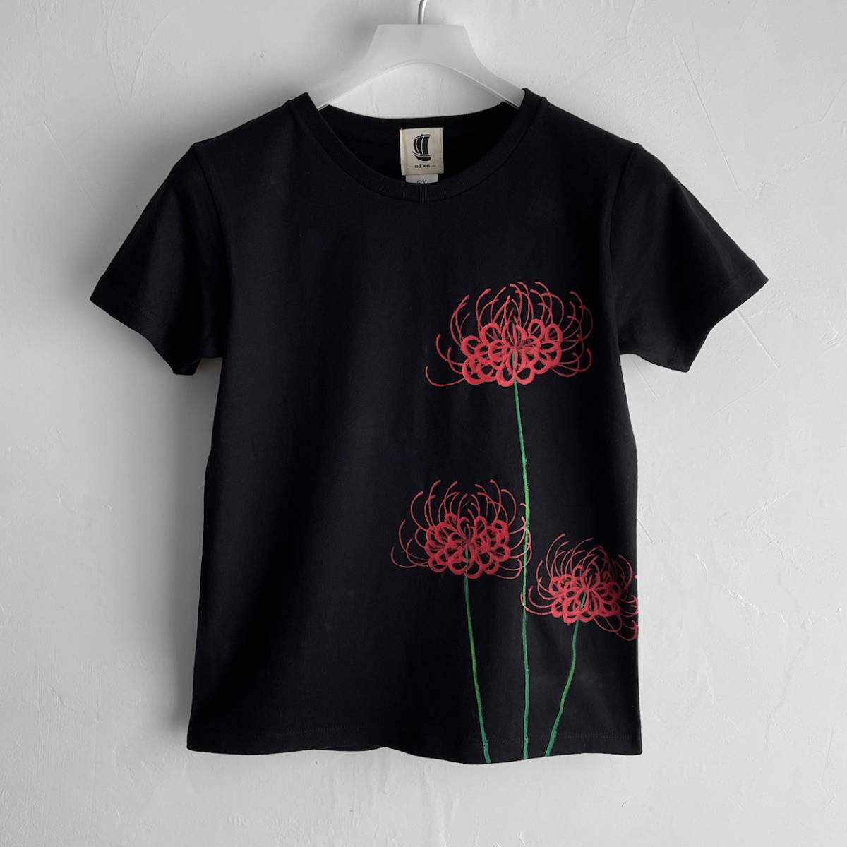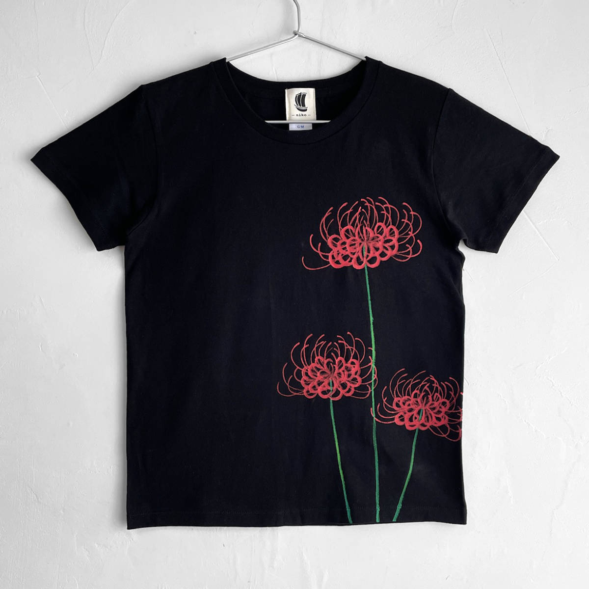 ハンドメイド 手描きTシャツ レディース Tシャツ彼岸花柄Tシャツ 手描きで描いたの彼岸花模様のTシャツ ブラック | |||