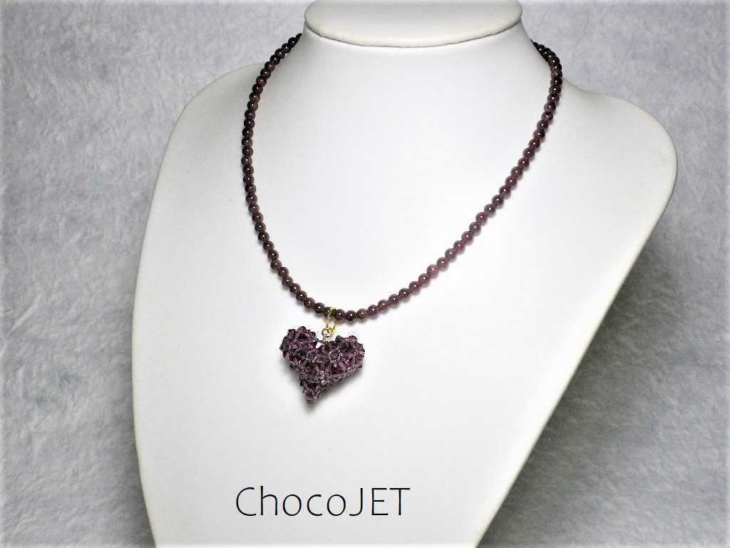 ネックレスは天然石ガーネット・ラウンド4mm。発色が深く濃いレッドパープルです。
