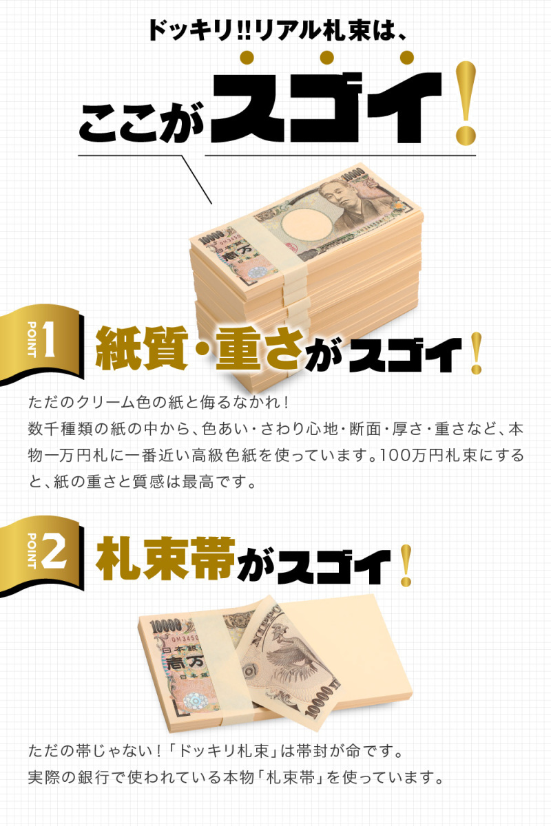 ●商品説明・1万円札と同じサイズでクリーム色の無地の用紙です。・帯は銀行で使用している本物です。・1束は100枚です。・この束の上下に本物の1万円札をいれて活用して下さい。※上記写真は、見本のため上に本物の1万円札を挟んでいます。ご使用時には、ご自分で本物の1万円札を入れてください。●サイズ 1万円札と同じ(縦76mm×横160mm)●重さ 約93g※くれぐれも悪用なさらないようにお願い致します。・アルミケースのサイズ 約26×18×11cm・3000万円専用のアルミケースです。★使用例・ドッキリとして家の机に置いておく・子どもや孫にお年玉、お小遣いとして渡してみてびっくりした顔を見る・SNS(インスタ、フェイスブック、ツイッター等)でお友達に自慢してみたりする・ギャンブル(パチンコ、スロット、競馬等)をする前にお祈りしてみる・宝くじと一緒に置いたりお財布に入れて金運アップ・お金を数える練習(画像、説明文の引用、転載は禁じます。)