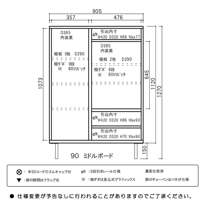 仕  様前面:ナラ無垢材(その他の部分は強化紙貼り)