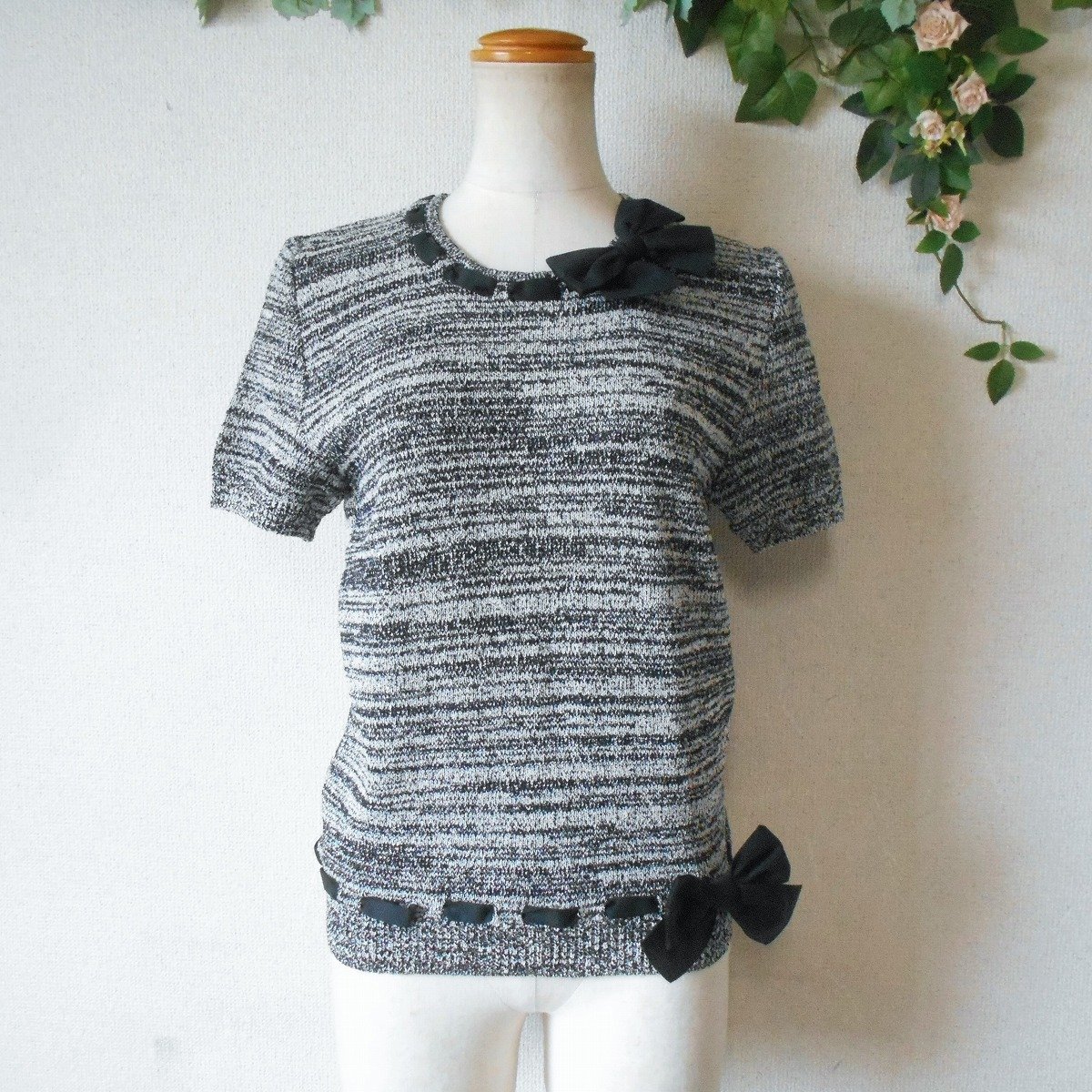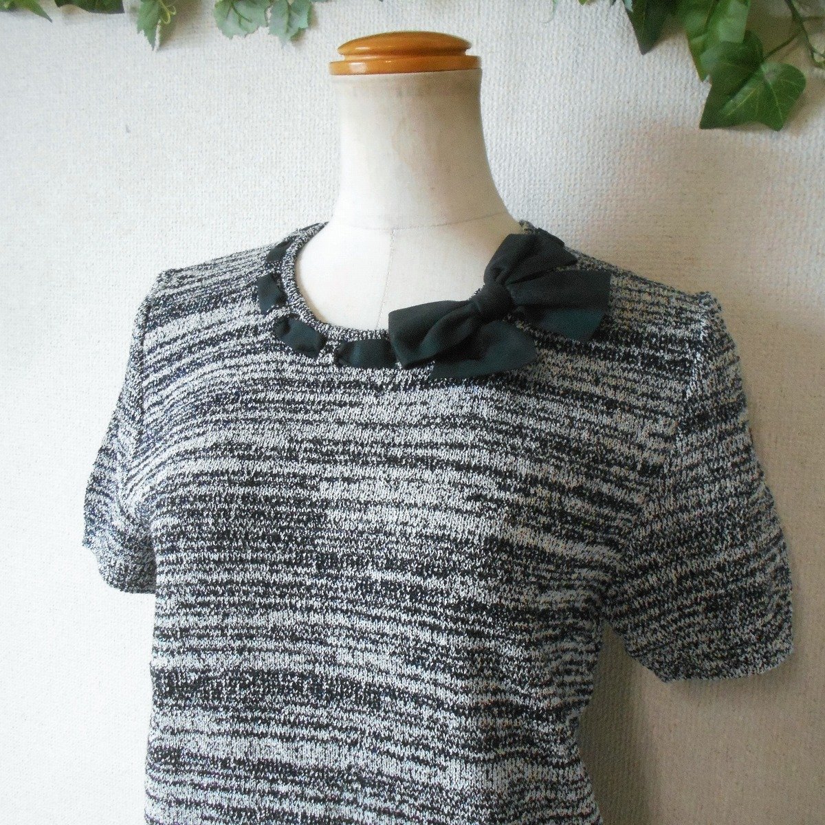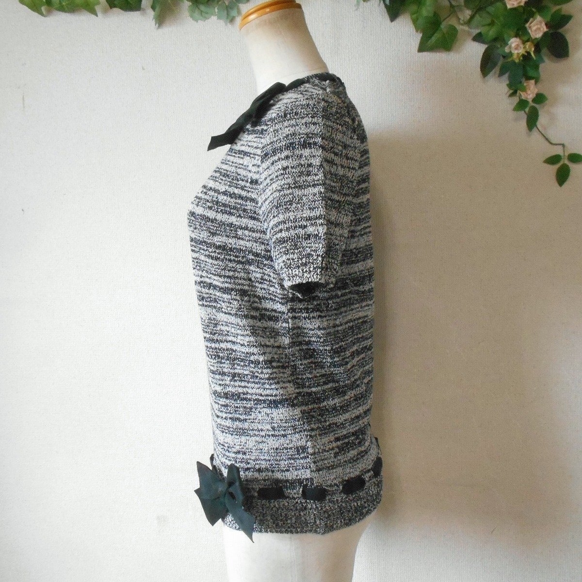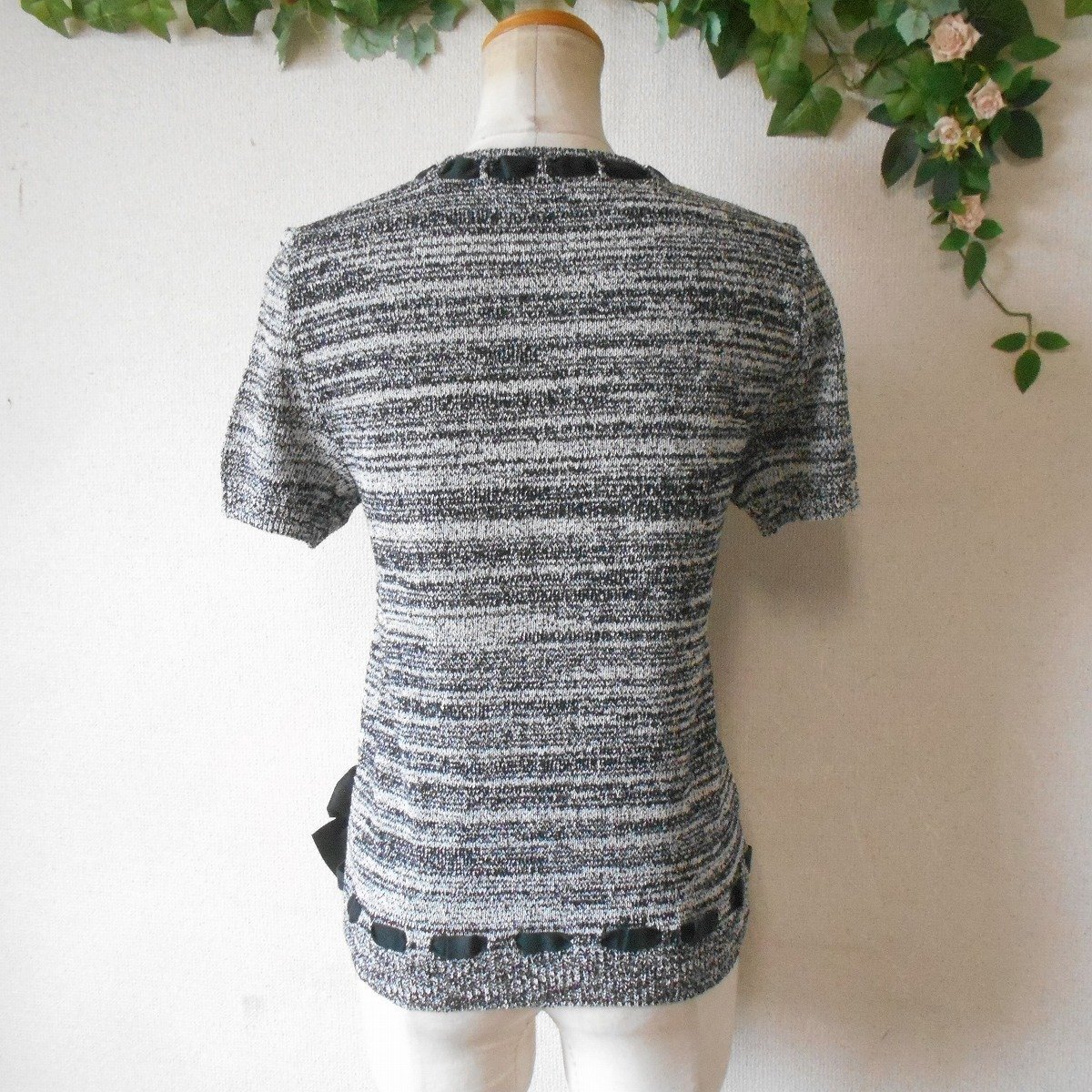 【ポイント】インゲボルグの半袖セーターになります。お色は白黒の混合で春や秋を中心に着ていただけるお品です。襟ぐりと裾には、はしごリボンが使用された、とっても素敵な一着です。