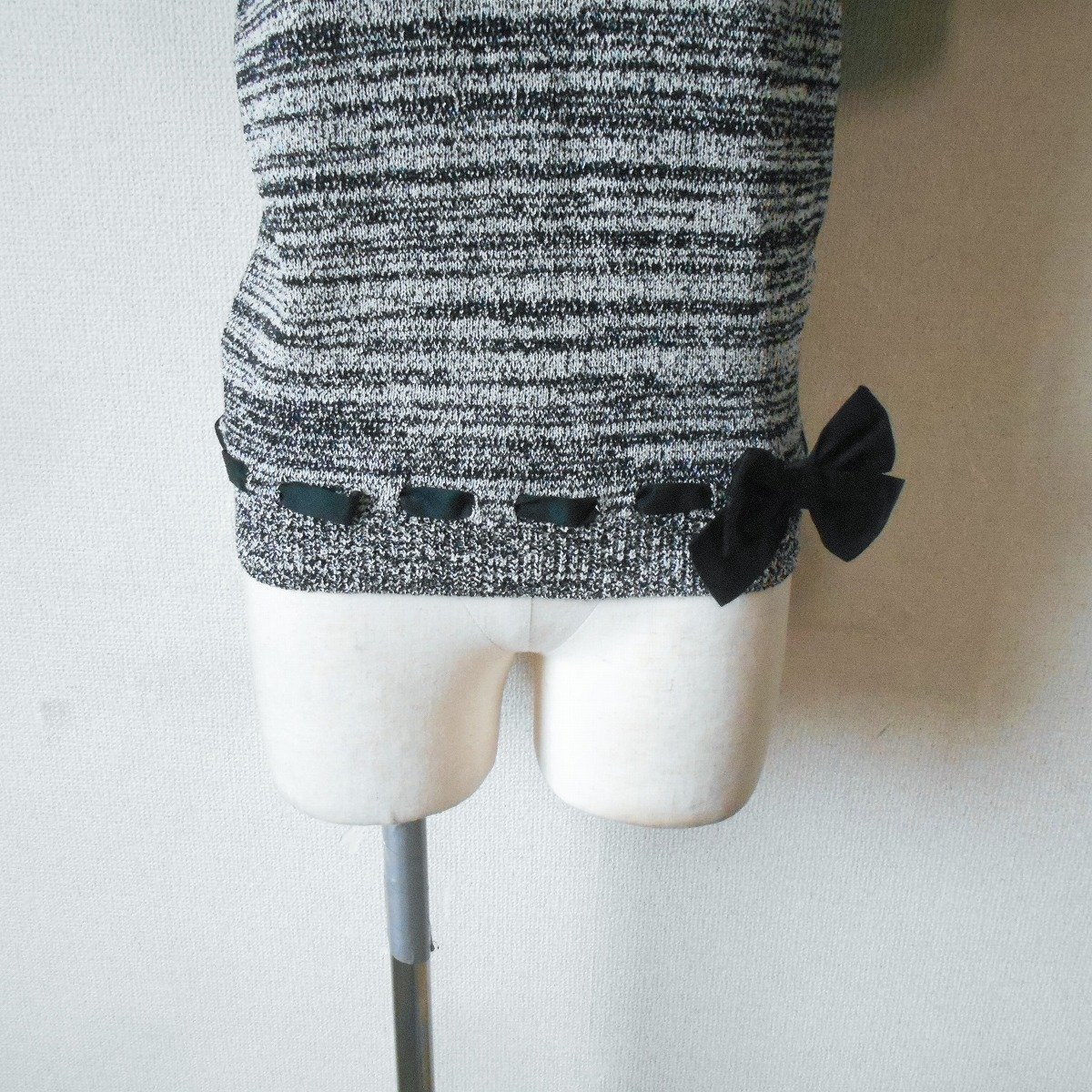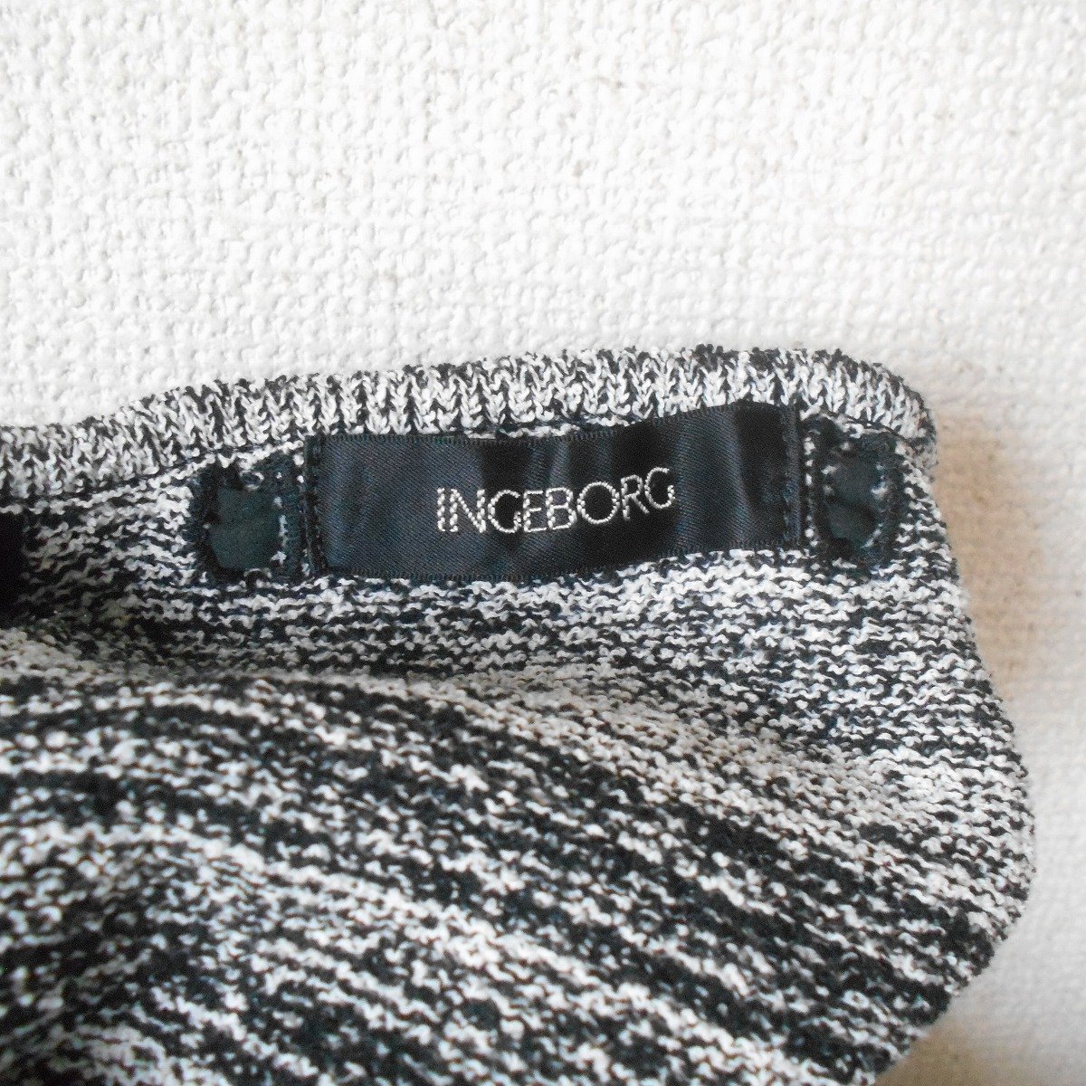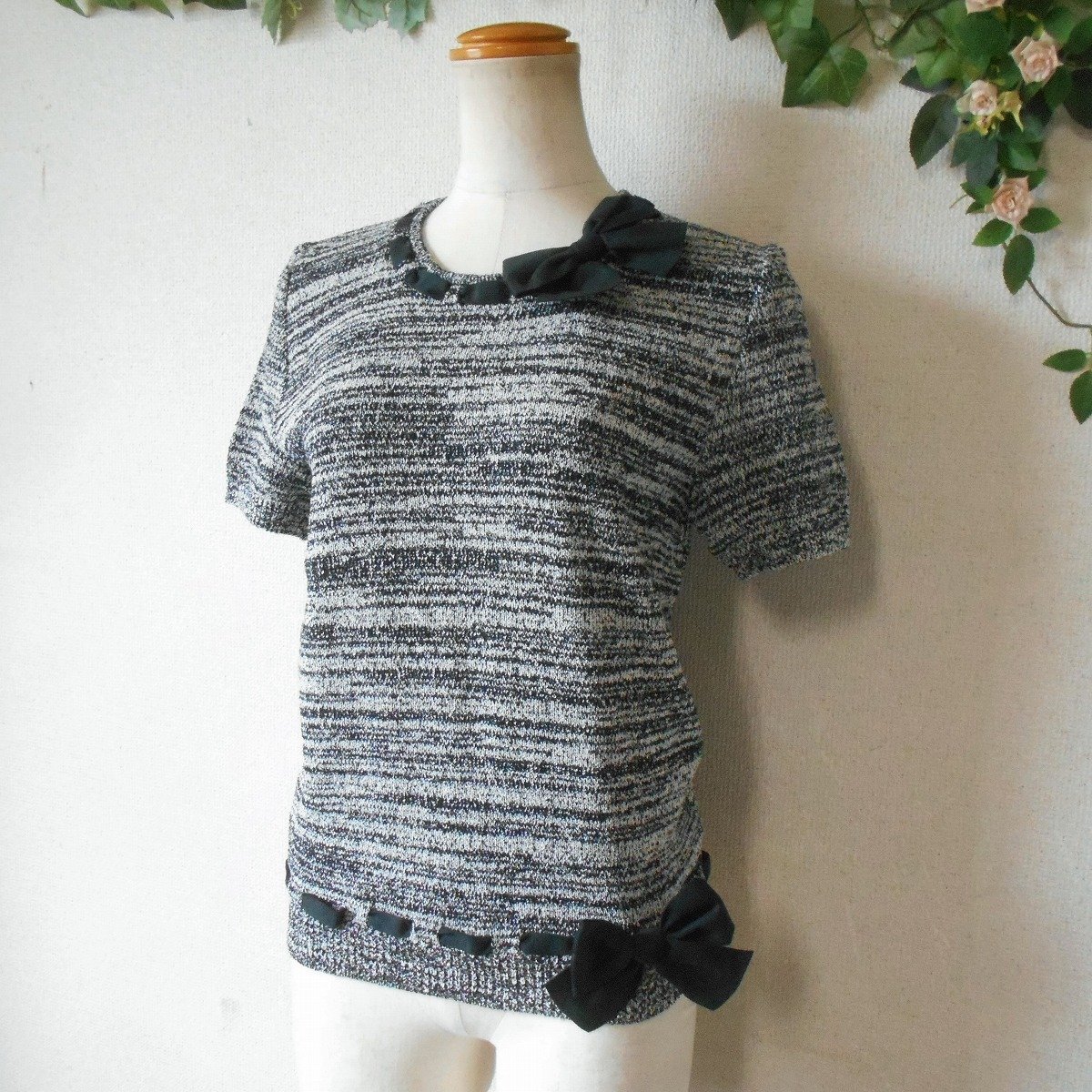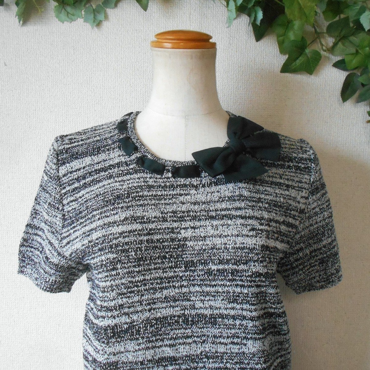 【ポイント】インゲボルグの半袖セーターになります。お色は白黒の混合で春や秋を中心に着ていただけるお品です。襟ぐりと裾には、はしごリボンが使用された、とっても素敵な一着です。