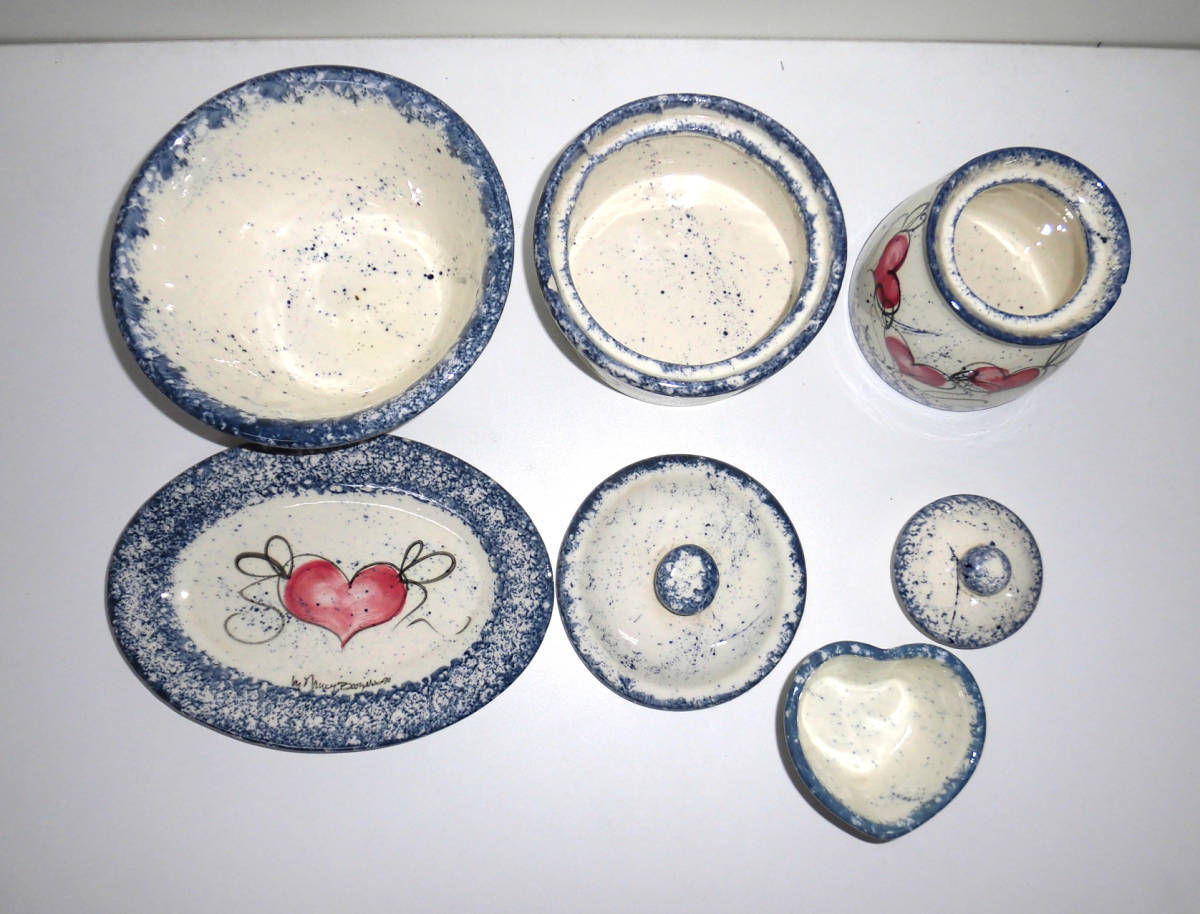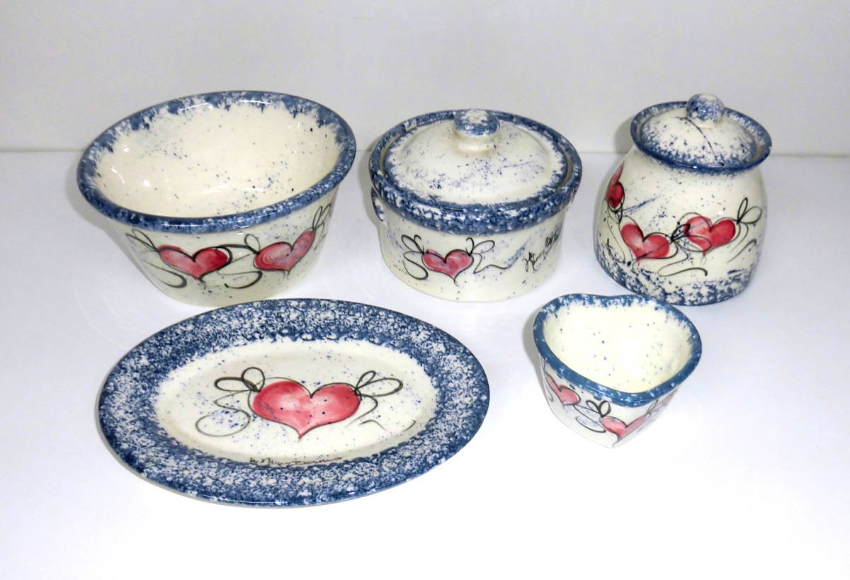 MADE IN USAのアメリカンカントリーハンドクラフトメーカー、Heart and SoulのNancy Boozerデザインのサラダボウルやポット、皿等の陶器の食器5点セットです。