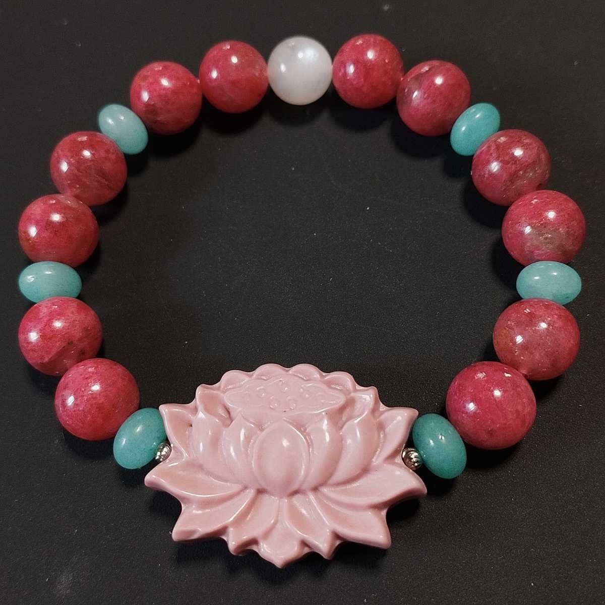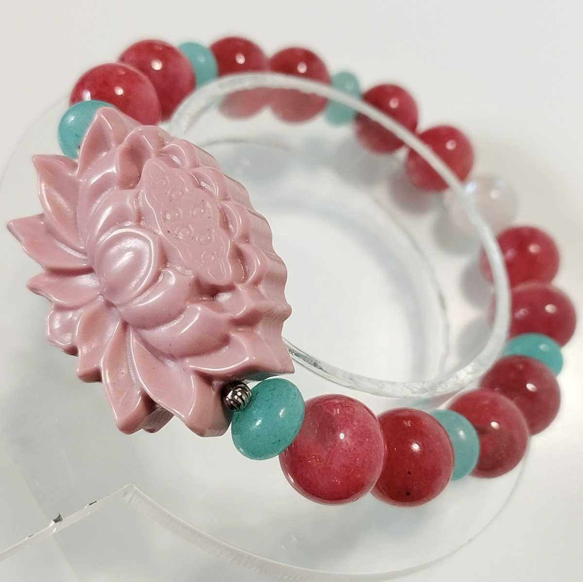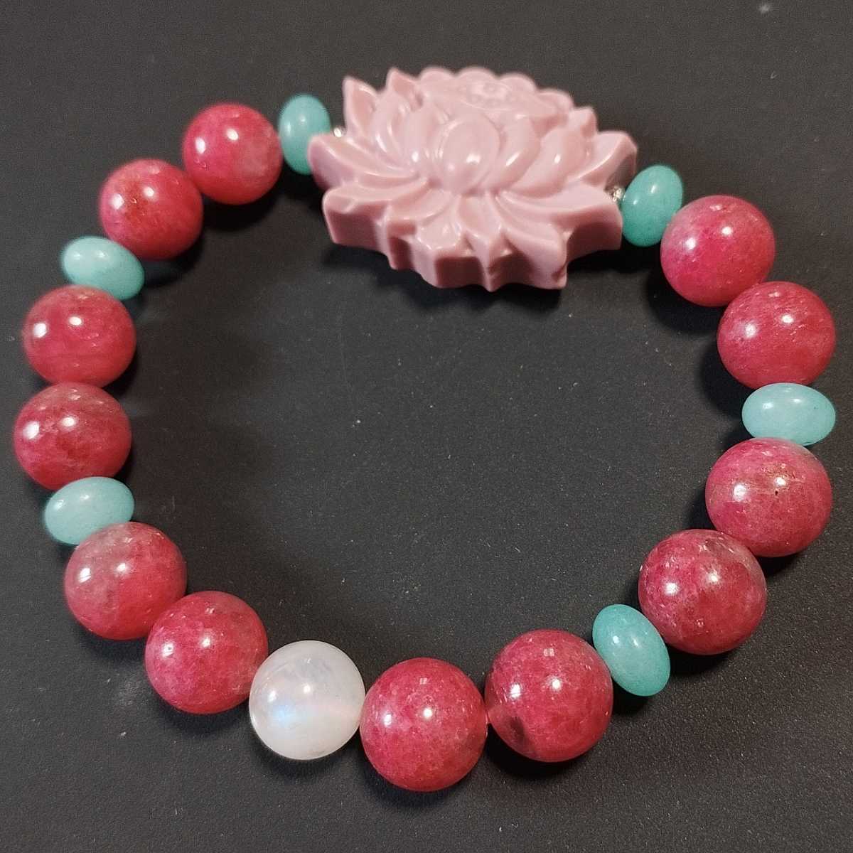 蓮(ロータス)の彫刻のアラシャン瑪瑙、鮮やかなカラーのロードナイト、ブルーシラーのきれいなホワイトラブラドライト、アマゾナイト、サージカルステンレスのデザインブレスレットです。