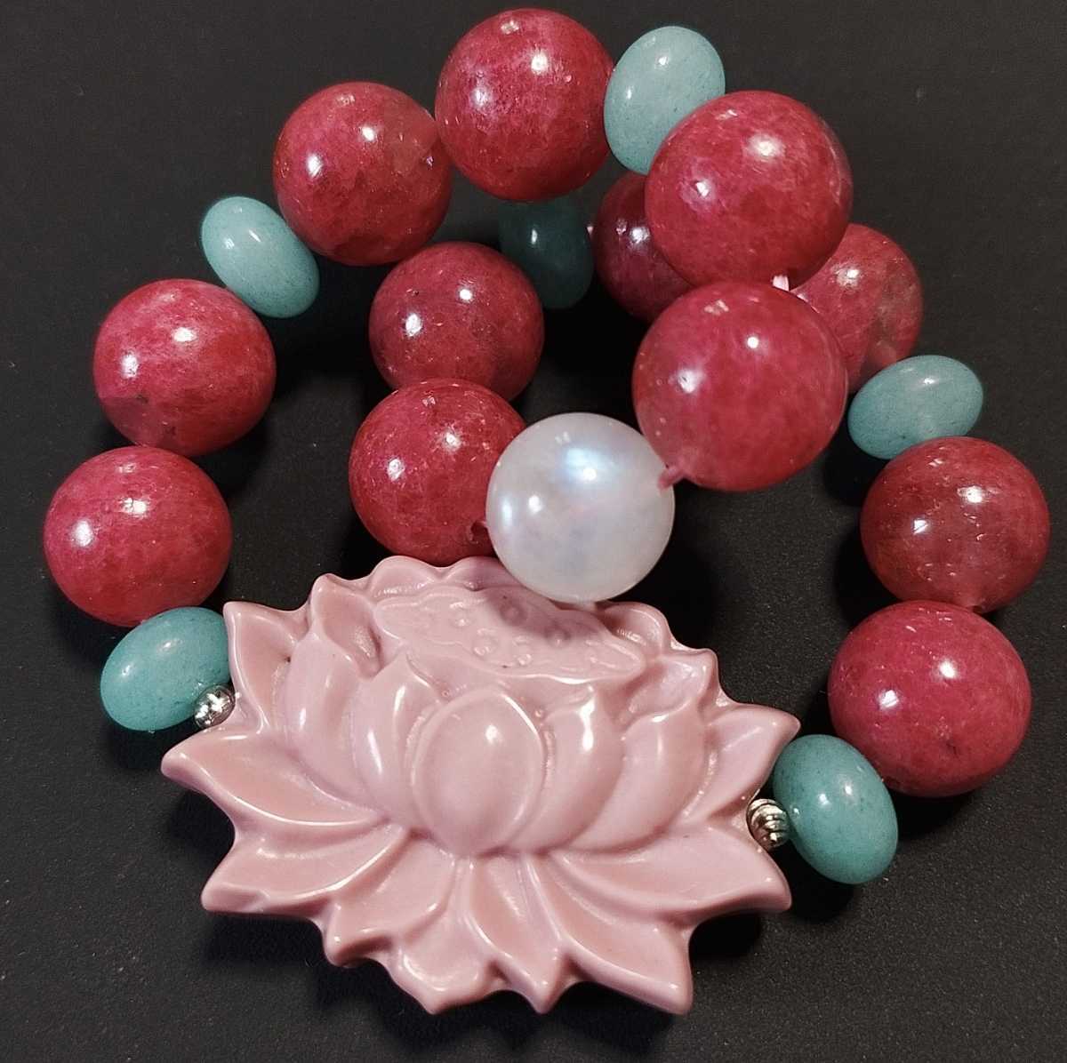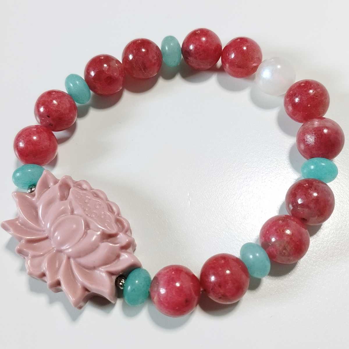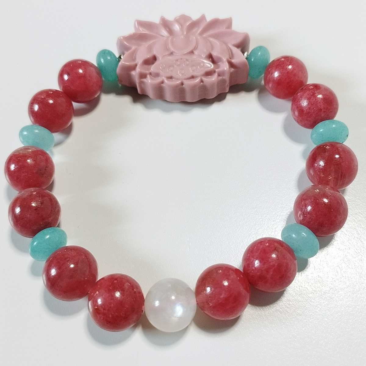 蓮(ロータス)の彫刻のアラシャン瑪瑙、鮮やかなカラーのロードナイト、ブルーシラーのきれいなホワイトラブラドライト、アマゾナイト、サージカルステンレスのデザインブレスレットです。
