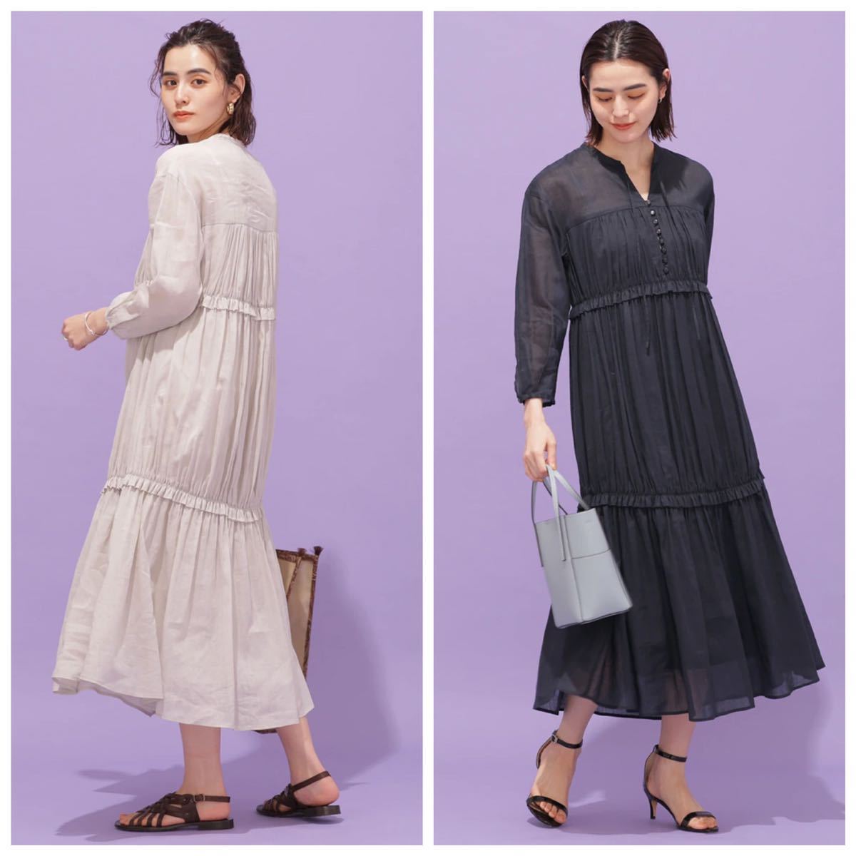 ティアード部分にフリルを施し程よい甘さをだしつつも、すっきりと大人フェミニンに着られる立体シルエットが好バランス。