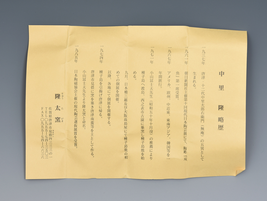中里隆 1937年 唐津で、中里無庵(十二代中里太郎右衛門)の五男として生まれる 兄は、中里重利 1959年 京都市立工芸指導所に学ぶ 1960年 京都清水坂の松風栄一に入門する 1961年 佐賀県立窯業試験場で井上萬二らに指導を受ける 朝日新聞社主催第十回現代日本陶芸展で、陶彫「双魚」が第一席受賞 1965年 ロバート・イングルと九州・四国の窯元めぐり 1967年 世界一周の旅、米、欧州、中近東、東南アジア、韓国などを巡る オハイオ州ウェズリアン大学講師として渡米 1968年 欧州・中近東を視察 1970年 韓国の古窯跡視察 1971年 小山富士夫の薦めにより種子島へ渡島。西之表市に築窯する(種子島焼) 1972年 小山富士夫の築窯を手伝う 1974年 唐津に帰り、隆太窯を築窯 越前と、沖縄県読谷でも作陶する 1980年 韓国鶏龍山窯跡視察 1983年 オーストラリアでデモンストレーション 1984年 インドネシア、ミャンマー、インド、ネパール、タイを訪問する 1985年 日本陶磁協会主催、現代陶芸選抜展賞受賞 1990年 北海道滝川にて青磁・白磁を作陶する |