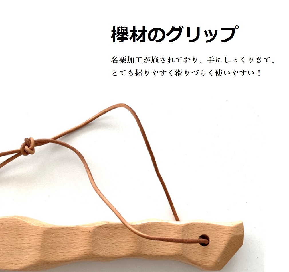 〇欅材のグリップ部には名栗加工(ボコボコとした加工)が施されており、手にしっくりきて、とても握りやすく滑りづらく使いやすいです。女性子供でも握りやすくとても使いやすくなっております。