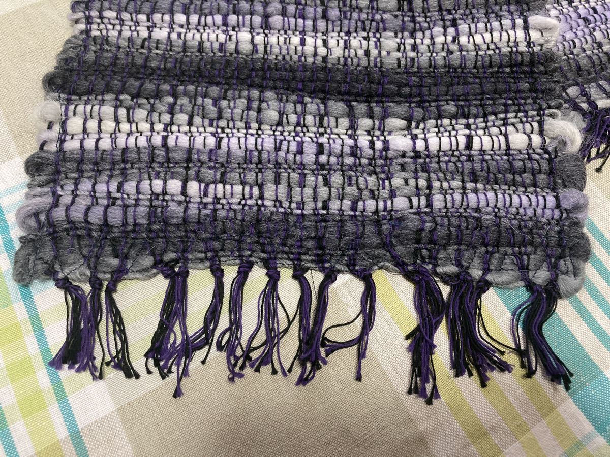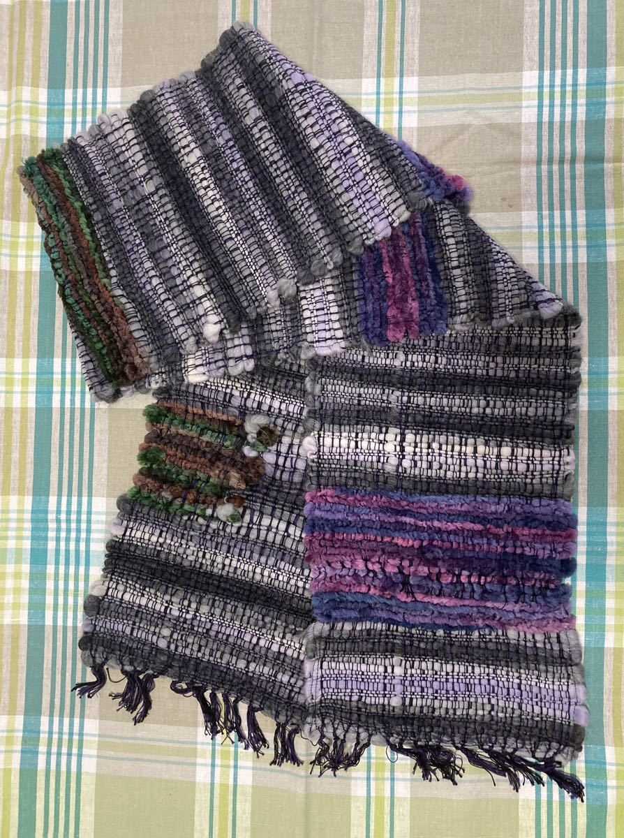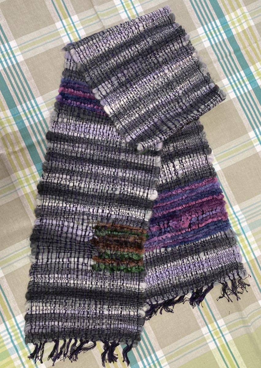 ☆ハンドメイド☆手織り一点もの ウールマフラー グレー/パープル マルチカラー 約横190cm×高さ25cm 美品