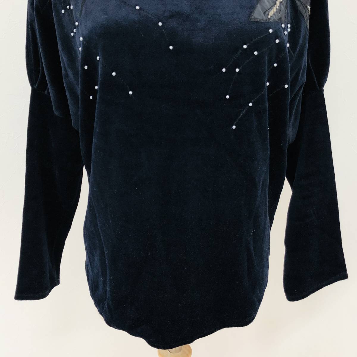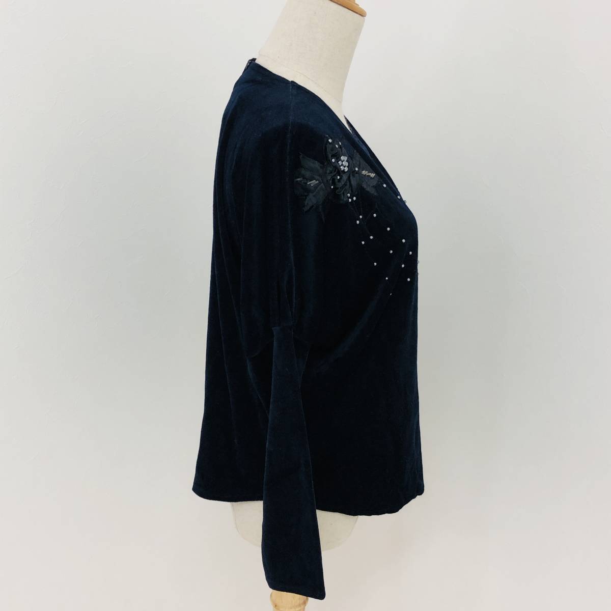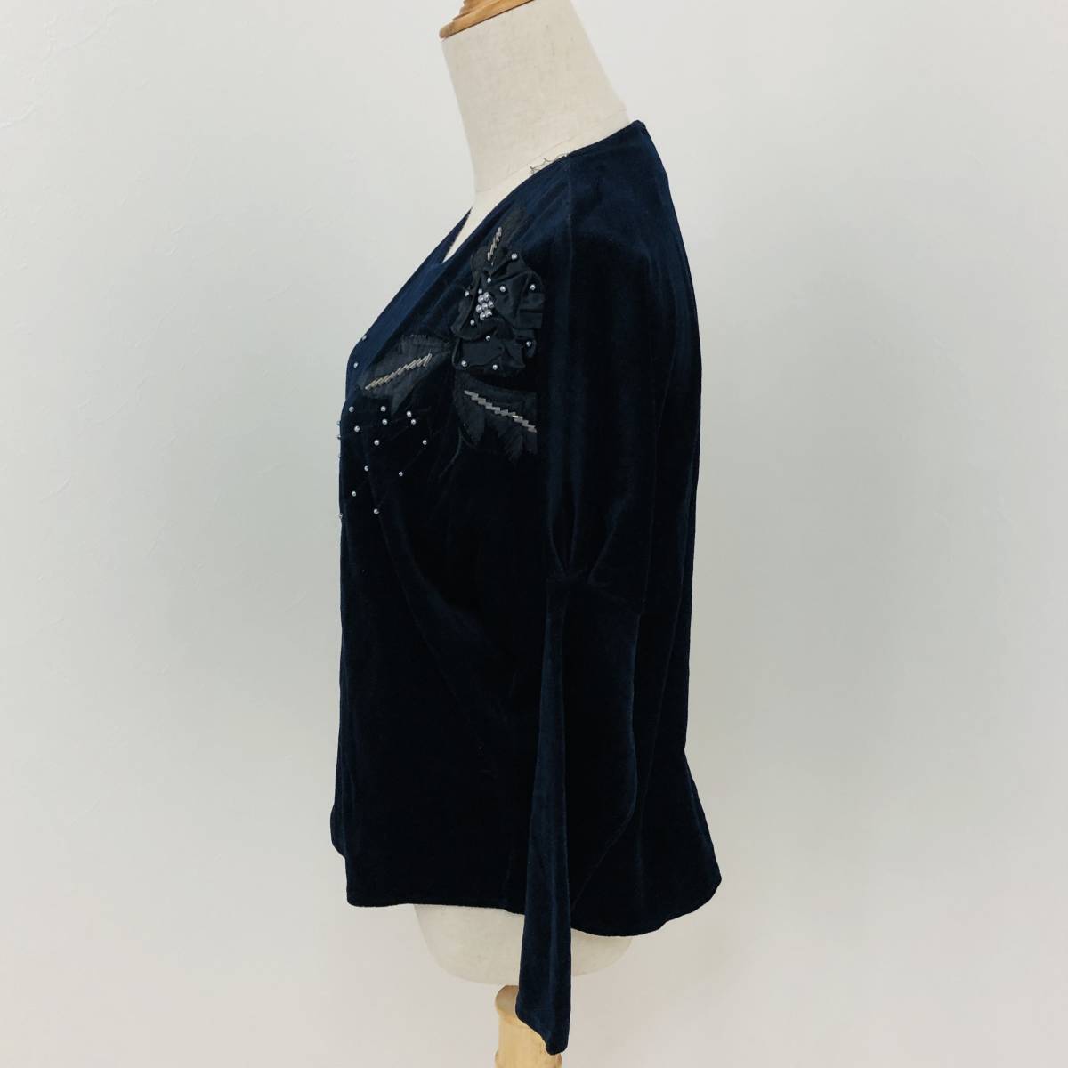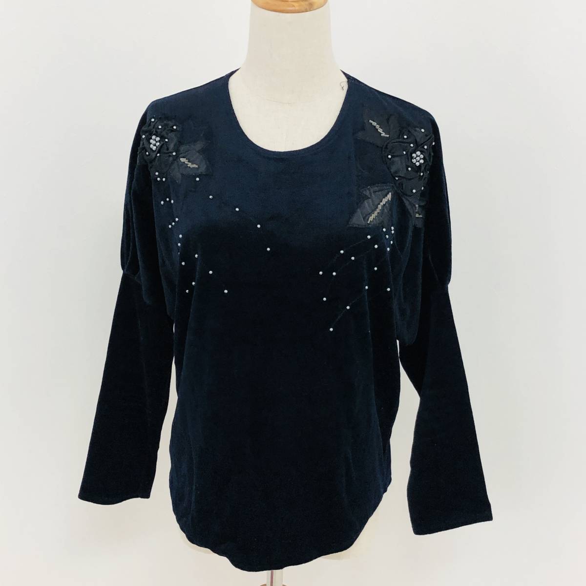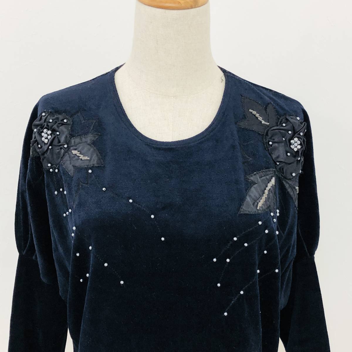 a01153 美品 トップス 長袖 丸首 ベロア調 ビーズ 花飾り ネイビー 秋 冬 昭和レトロ エレガント レディース レトロヴィンテージスタイル