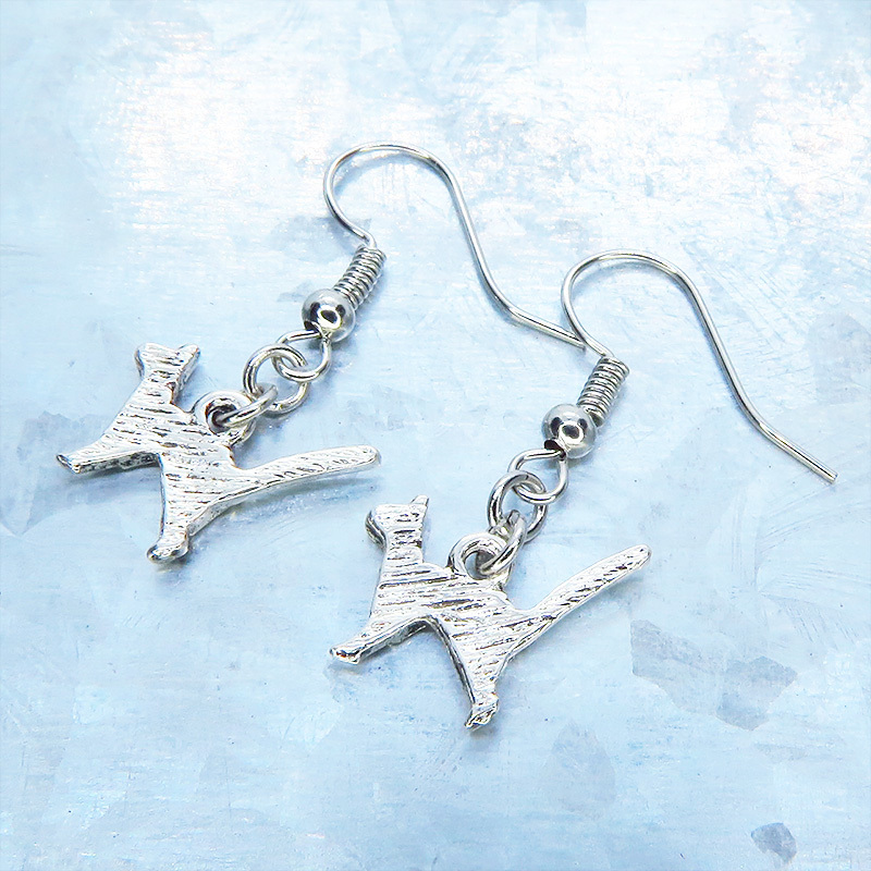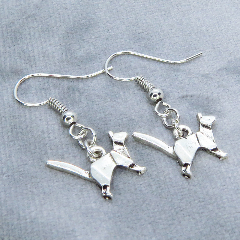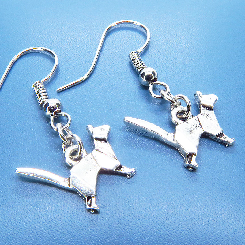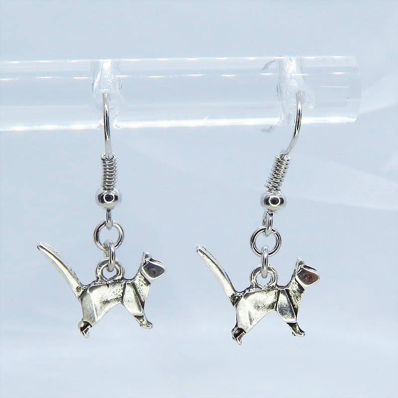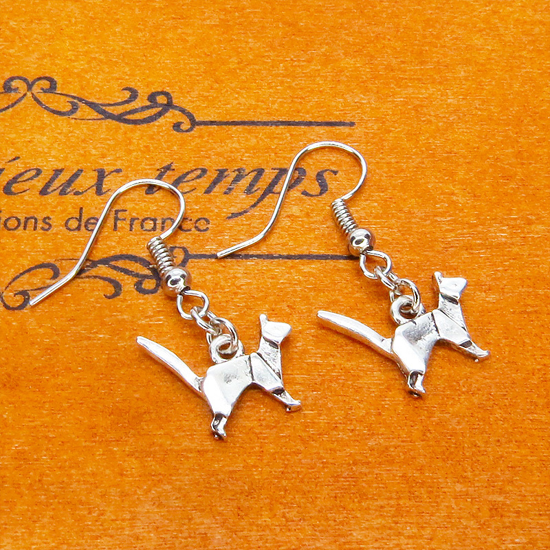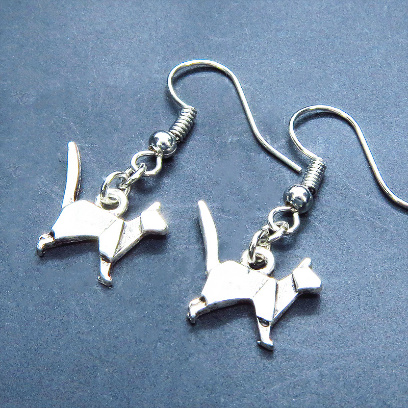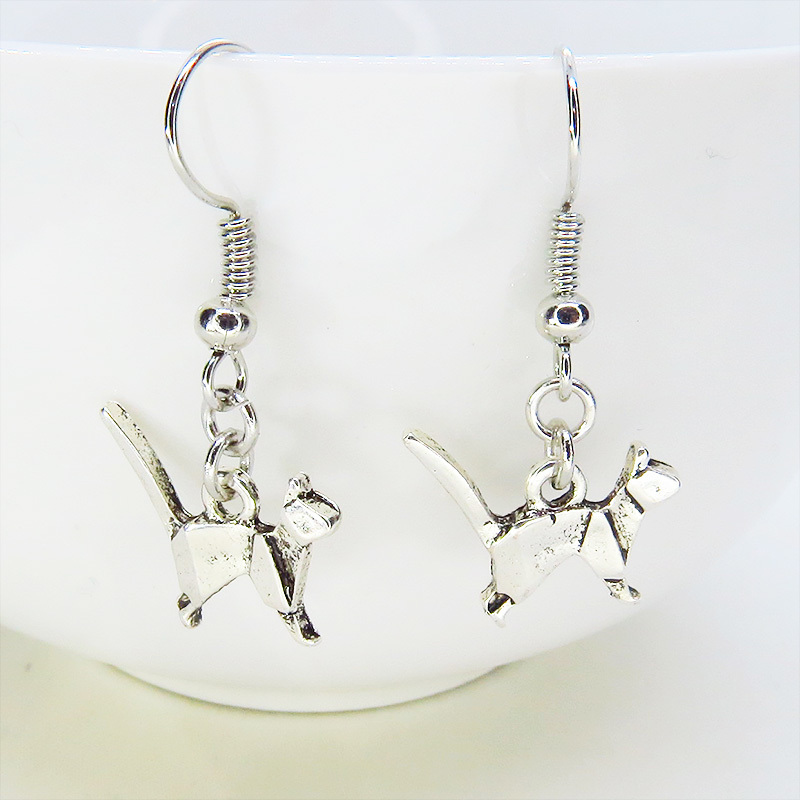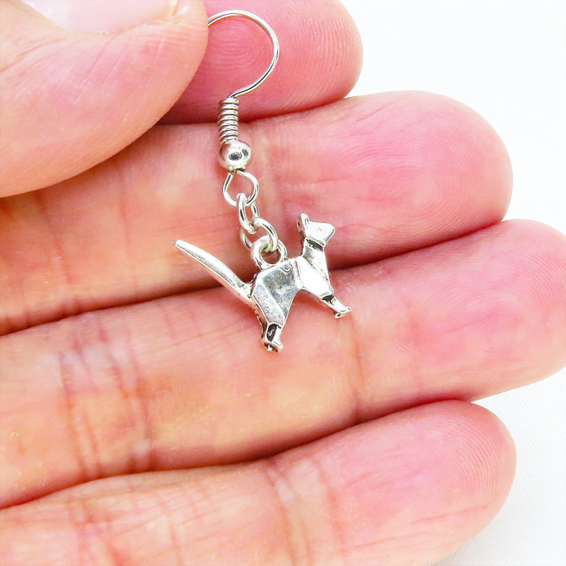 アンティークシルバー 折り紙のような歩き猫チャームを使ったコンパクトなピアス シンプル サージカル可