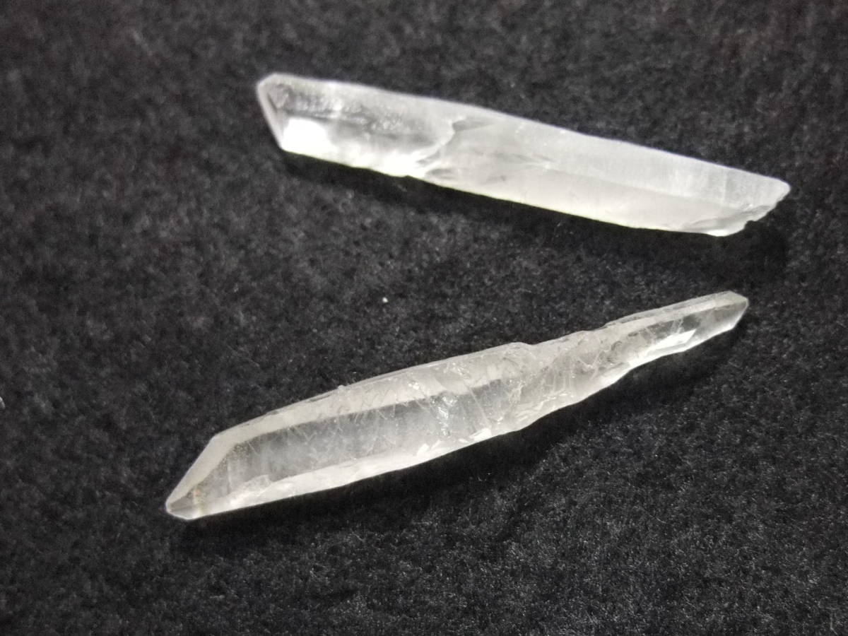 南米ブラジル産の高品質な水晶の中でも、総生産に対して少量しか採れない、細いレーザーワンドに成長した結晶。そのなかでも特定の条件が整ったもののみが、高音の金属的な“チン”、“キン”といった音がでるという、シンギング水晶。こちらは細い小粒系ですがすらりとした長めのレーザーワンド。音の質の良いルースでペア取りをしてみました。音重視なので、形や大きさ、雰囲気はペアではないですが、まずまず揃っているかと思います。パワーストーンやヒーリング好きの方に人気のお品ですが、もちろん、標本として観賞用などにも、石質も良くお薦めです☆