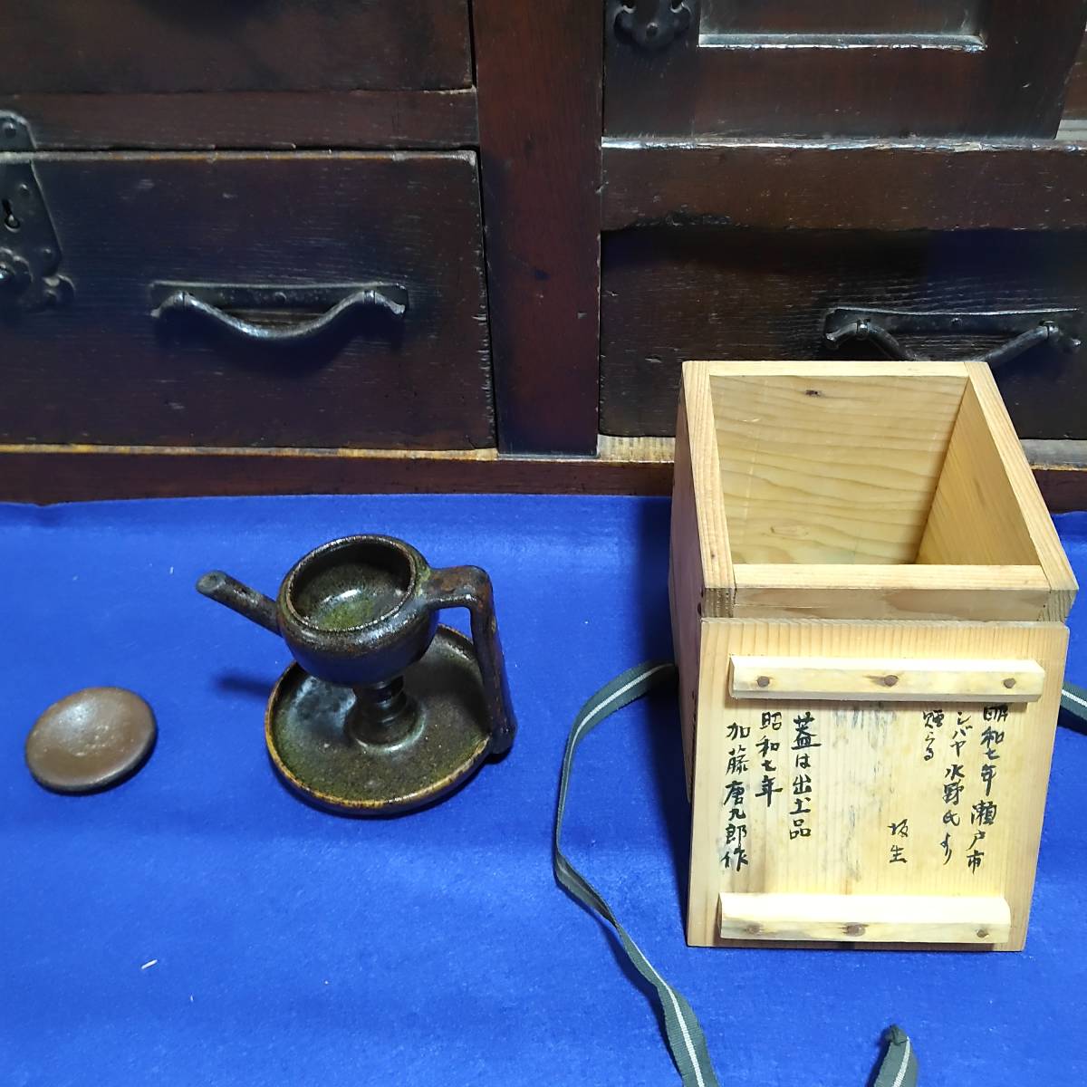 (鳥羽庵)完全売り切り品蔵出し 燈火器 瀬戸焼箱合わせ箱加藤藤九郎真贋不明 商品サイズ 横幅11.4センチ 高さ10,4センチ 重量287グラム 商品状態説明蔵出し 燈火器 瀬戸焼箱合わせ箱加藤藤九郎真贋不明です。状態も極上品です。合わせ箱に作者の銘書いてありますが真贋不明です。合わせ蓋は、出土品とありますがそれも不明です。 箱書き昭和7年作 詳しくは写真参照でお願いします。 発送は、ゆうパックにて発送いたします。 落札後ヤフーシステム期間内すべて取り引きお願いします。
