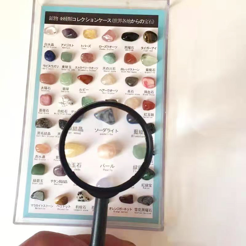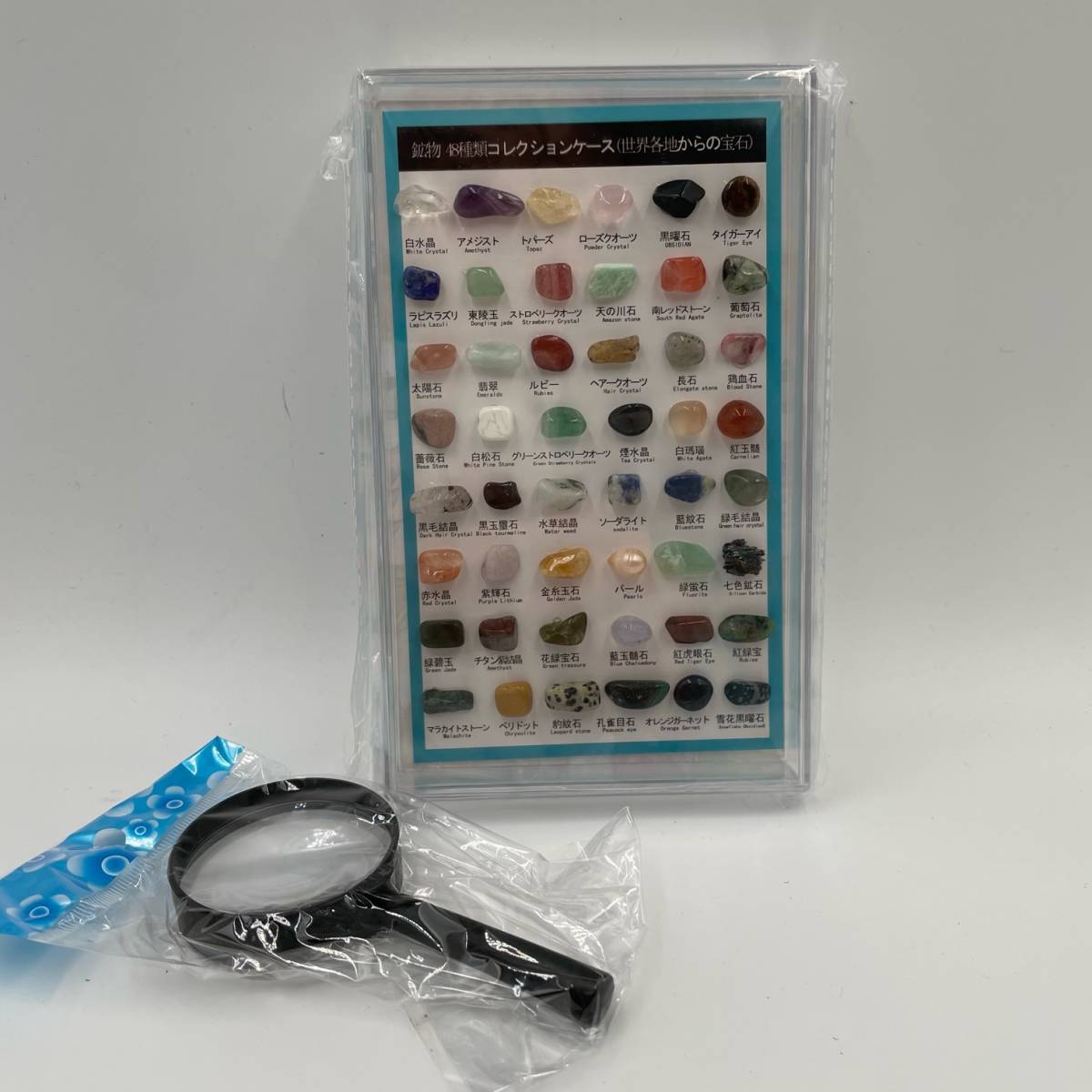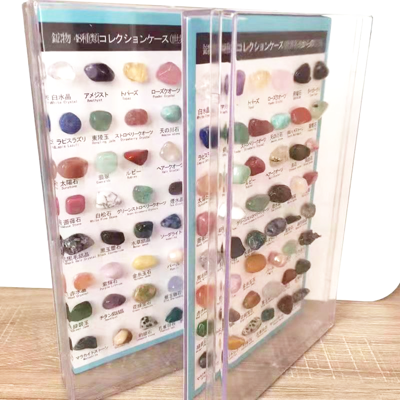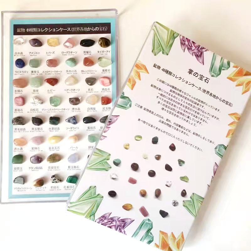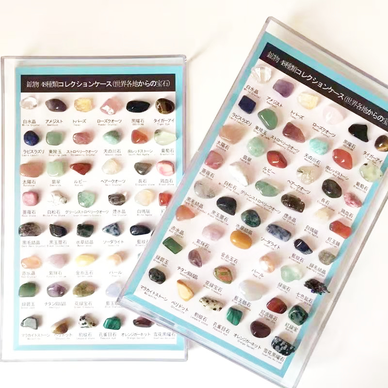 天然石と鉱物が48つセット。 中には、アメジスト、ローズクォーツ、黒曜石など有名な石があります。