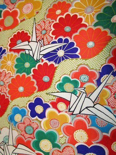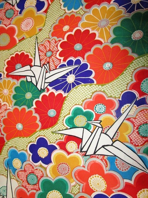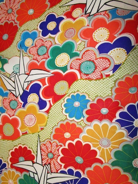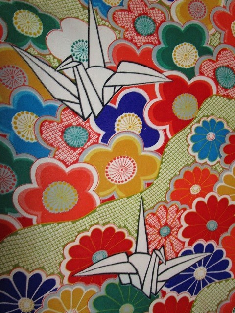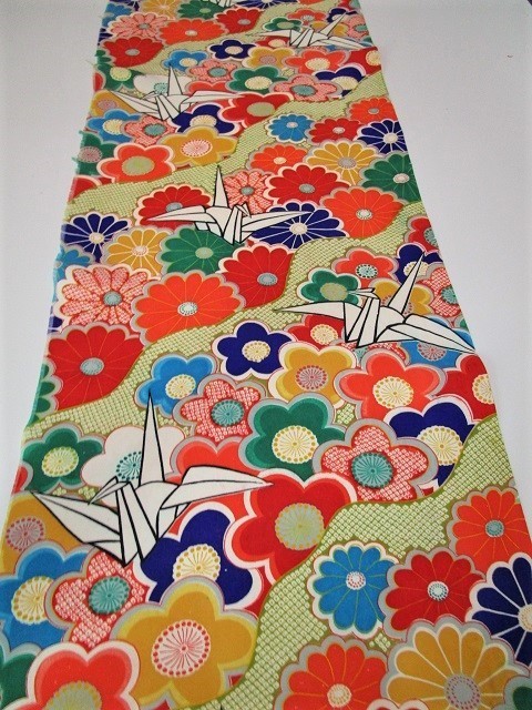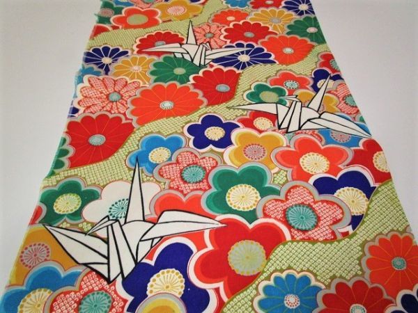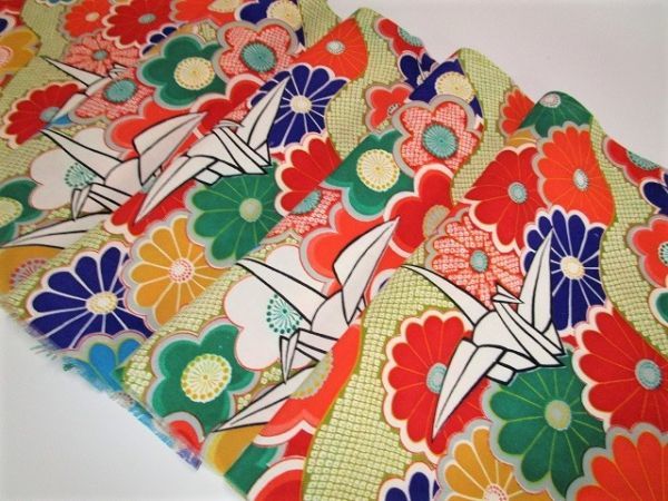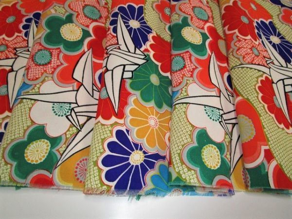 D-63★赤黄緑青紫*梅*折鶴*人絹*古布はぎれ★アンティーク/文化人形/一閑張り/吊るし雛/市松人形