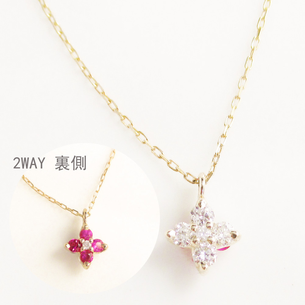 ポイント! | 裏側はルビーのお花になっています。 リバーシブルで2倍楽しめるお得な1品です。 ご希望でルビーをサファイヤに交換致します。 自分用 普段使い はもちろん 誕生日 母の日 クリスマス 記念日 等 贈り物 にも最適です。 |