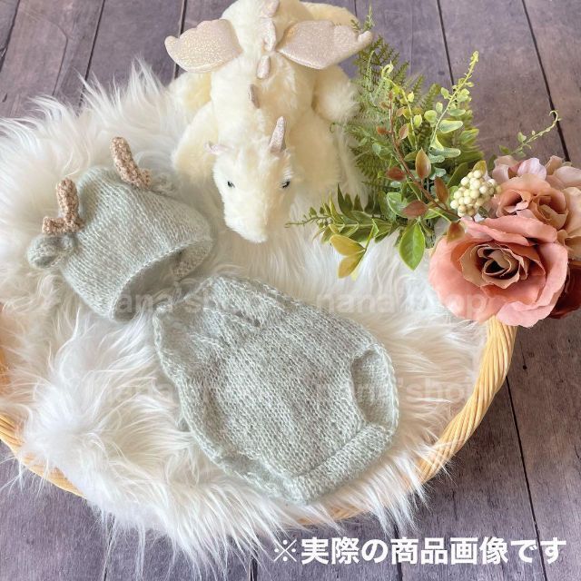 ニューボーンフォトのコスチューム、角と耳のついたタツ帽子と編み込みオーバーオールの2点セット。
