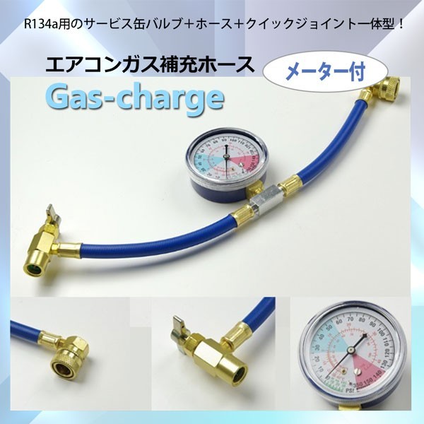 エアコンガス補充ホース! メーター付ガスチャージホース R134a用のサービス缶バルブ+ホース+メーター+クイックジョイント一体型! ホースには、低圧カプラー、サービス缶バルブが付いているので、簡単にエアコンガスの充填が行えます。 【ポイント】 メーター付き一体型ガス補充パーツ! 【商品名】 メーター付ガスチャージホース 【商品番号】 gas-charge-mt 【商品内容】 サービス缶バルブ+ホース+メーター+クイックジョイント一体型パーツ 【商品仕様】 ホース長(約):410mm 重量(約):237g ゲージ範囲:10~100psi 対応冷媒:R134a 【注意事項】 ※ガス管は付属しておりません。 ※取扱説明書は付属しておりません。 ※輸入品につき本体に僅かなキズ・スレ・さび汚れなどがつく場合があります。 ※入荷時期により予告無くデザイン・色・サイズなど、細かな仕様が変更される場合がございます。 ※ご使用の際は、材料及び使用箇所に十分ご注意して行って下さい。 ※色合いの感じ方には個人差があり、撮影状況・PC環境により色合いが異なる場合がございます。 ※細かい点が気になる方、神経質な方はご注文お控えください。 ※他サイト間で在庫を共有しているため、在庫更新のタイミングによってはページ上の在庫と実在庫に相違が出る場合がございます。 予めご了承ください。 在庫切れや入荷待ちとなる場合は別途ご連絡いたします。 ご注文前に必ずご確認下さい ⇒ お買い物ガイド |