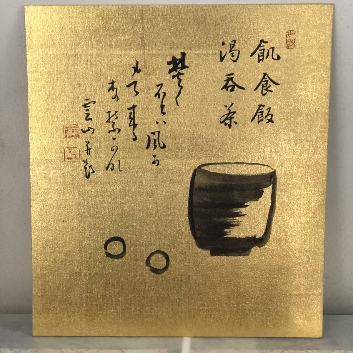 《美術品》 額入り「飢 食 飯 湯 呑 茶:雲山?(判読不可) 色紙絵」 額(縦幅×横幅:約60.8cm×51.3cm) 銘・押印有り 書・筆絵