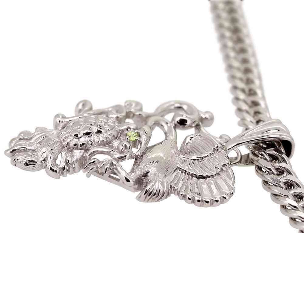 8月誕生石ペリドットを使用したプラチナ製の、鶴と亀モチーフのメンズペンダントヘッドです。