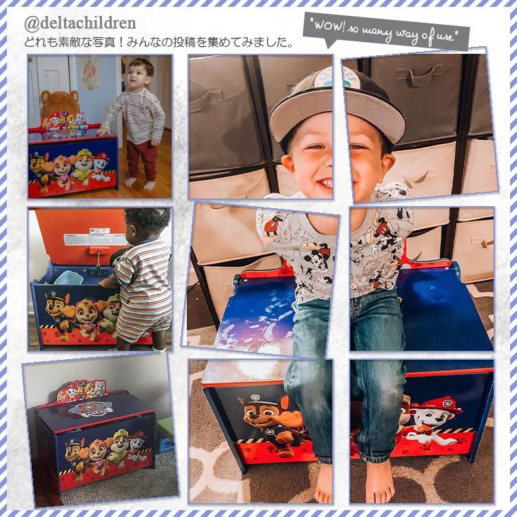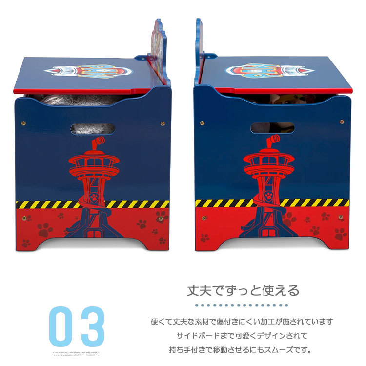 | 仕様 | お人形や絵本などおもちゃ箱から、衣類収納に。 子供達が大好きなキャラクターだからこそ、満足出来る1点。 安全面を考えて、角は全て丸く削られていて、フタはゆっくりと閉まる設計、 フタとの接触面は隙間を作り指を挟む心配がなく安心。 フタを閉じると、テーブルの様に、お絵かきも楽しめる! |