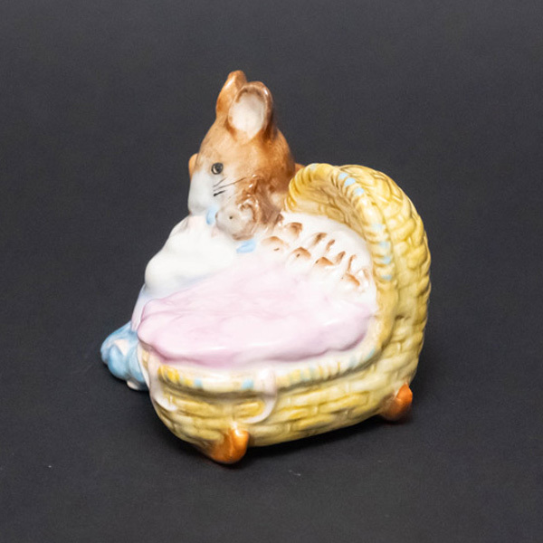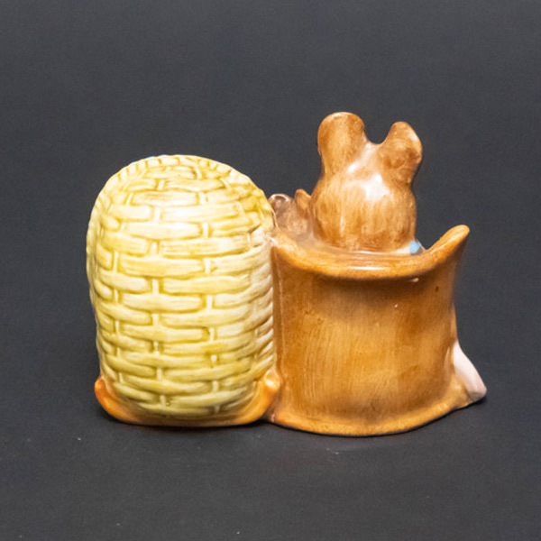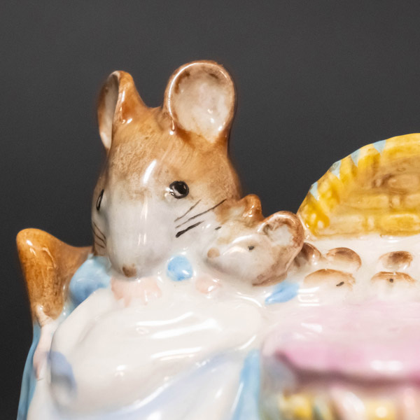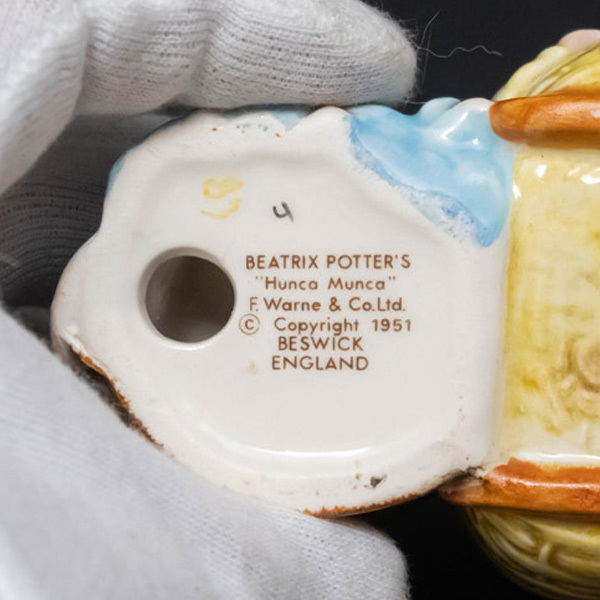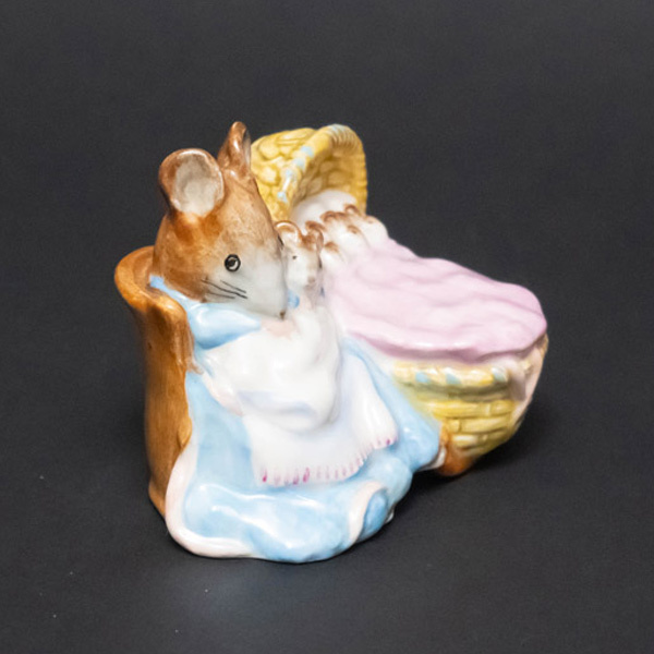 イギリスの陶器メーカー、ベスウィックのビアトリクス・ポターシリーズのフィギュリン『Hanca Manca(ハンカ・マンカ)』。 ビアトリクス・ポターの『ピーターラビットのおはなし』の登場人物のモデルにしたフィギュリン。こちらは『2ひきのわるいねずみのはなし』に出てくるトム・サムの奥さんのハンカ・マンカと子どもたち。タイトルでいうほど悪人じゃないです。 ■サイズ 横幅82 × 高さ66 × 奥行68mm ■付属品 なし ■状態 B(良品):特に目立つダメージのない、状態の良いお品物です。 |