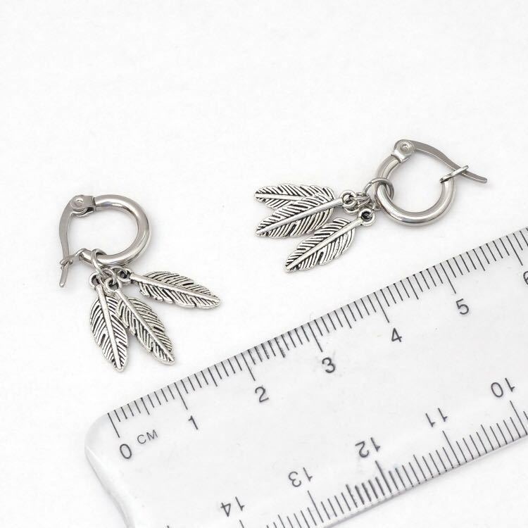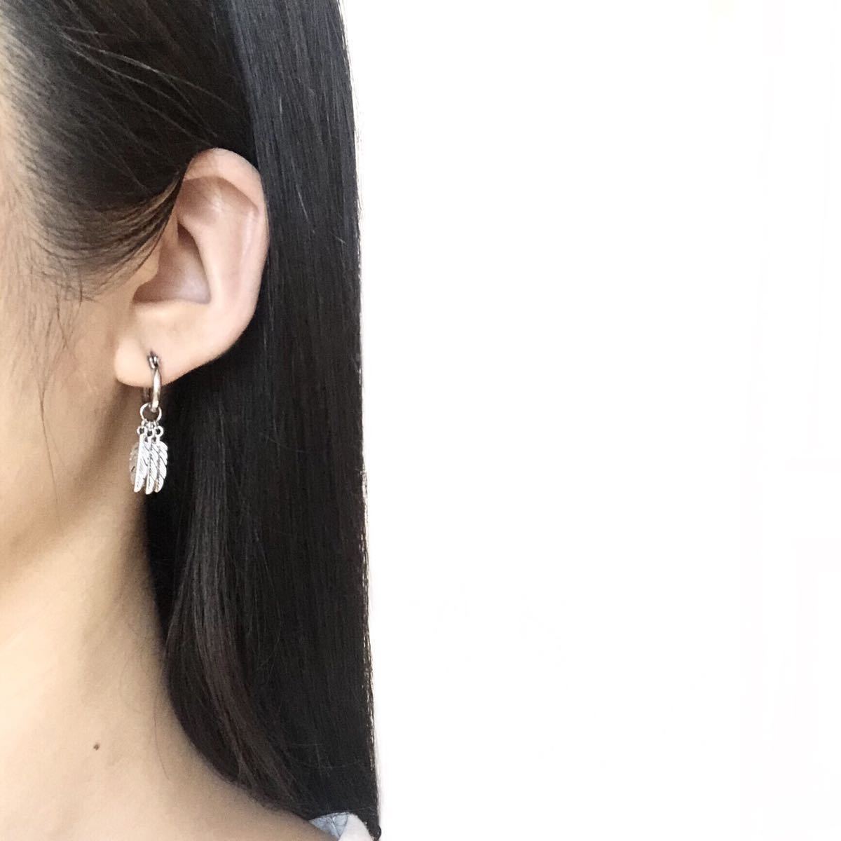 動くたびに揺れる、小さな3つのフェザーチャームが魅力のフープピアスです。お肌に優しいサージカルステンレス製で、アレルギーなども起こしにくいお品です。