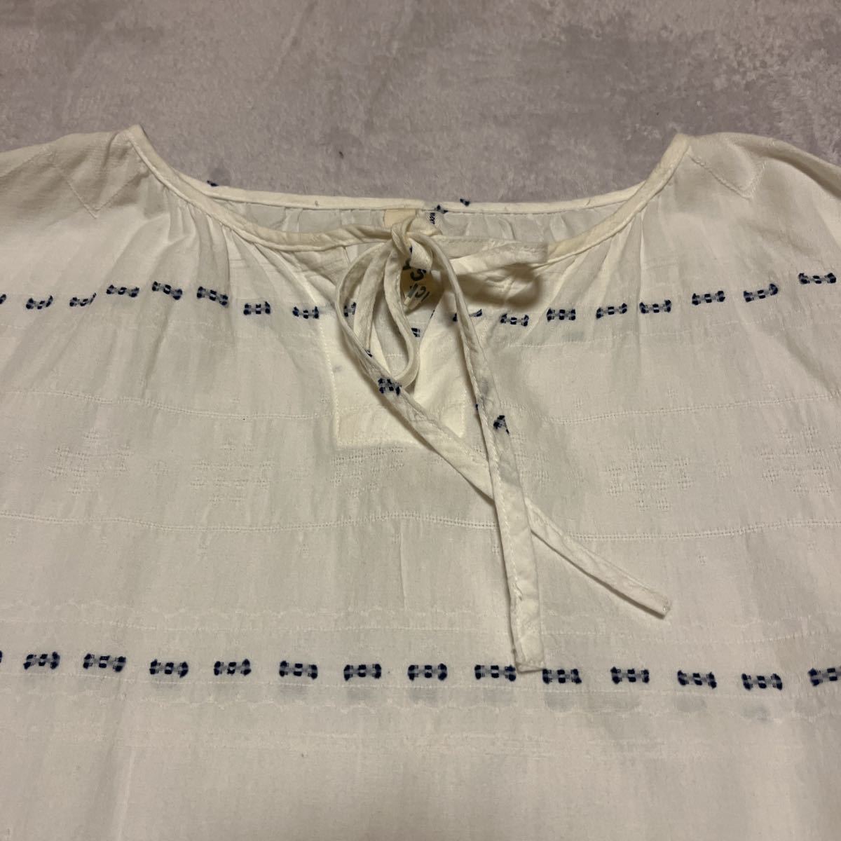 白地に地模様に紺色で小さな模様が織り込まれた生地のワンピースになります。