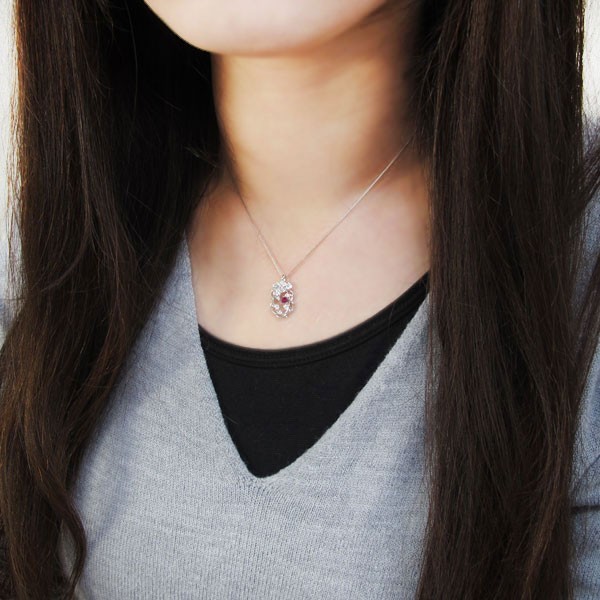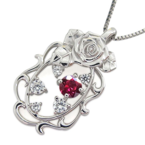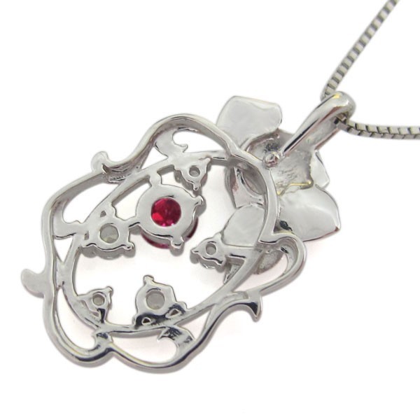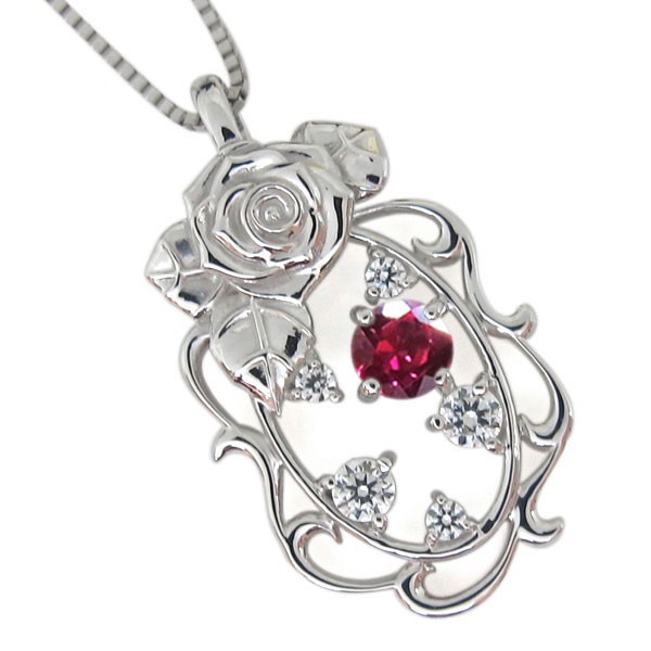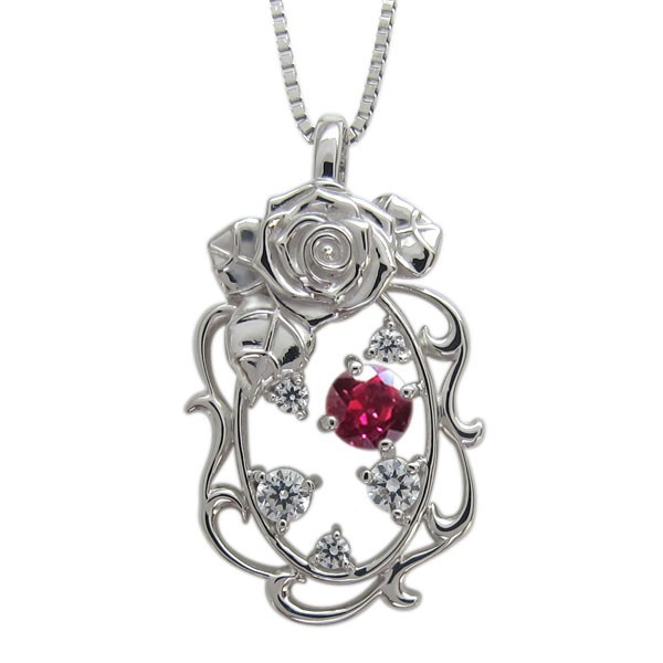 7月誕生石ルビーを使用したプラチナ製の唐草(アラベスク)&薔薇(ローズ)モチーフネックレスペンダントです。