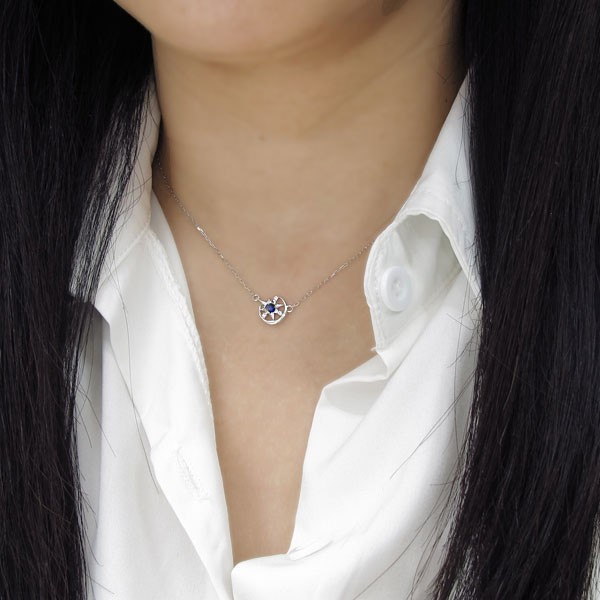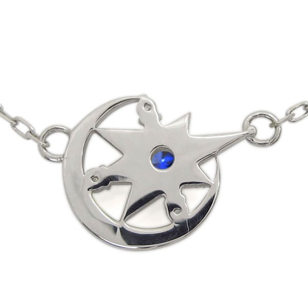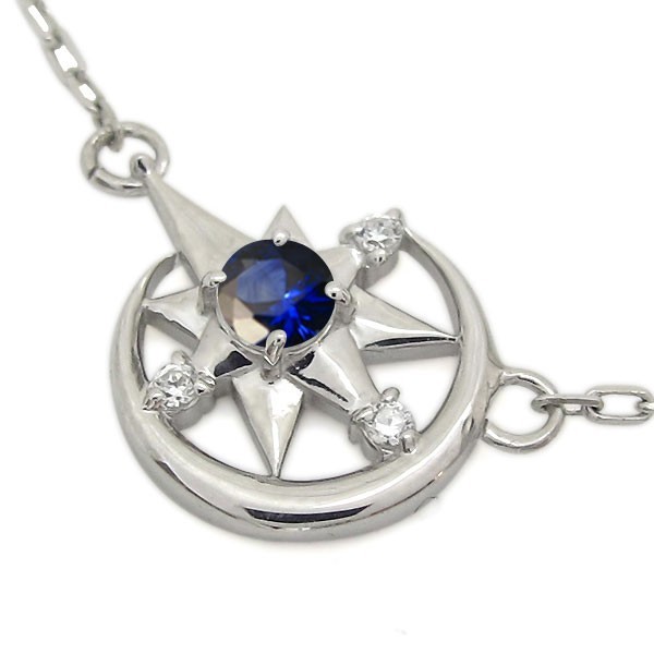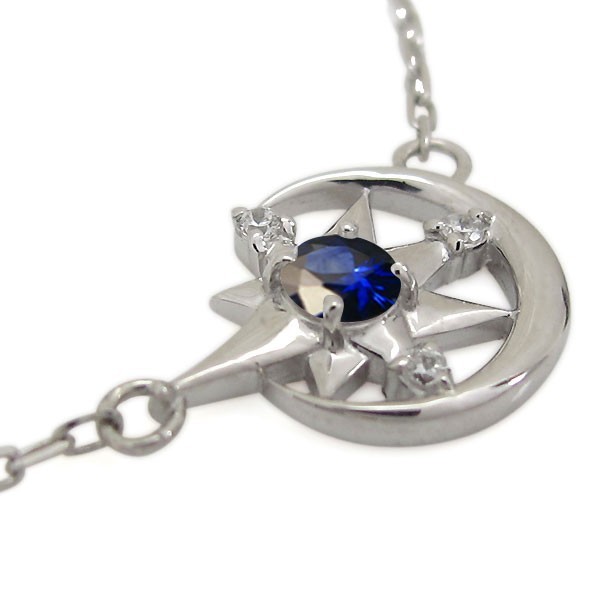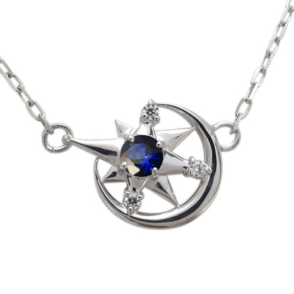 9月誕生石サファイアを使用したプラチナ製の、三日月(ムーン)と星(スター)モチーフレディースネックレス(ペンダント)です。