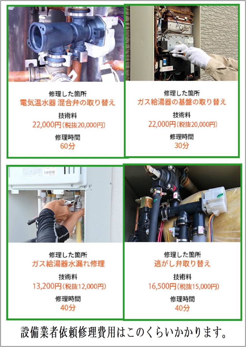 数ある商品の中からご覧いただきましてありがとうございます。 誠意をもちましてご対応してまいります。 宜しくお願い致します。 ~・~・~・ 商品詳細 ~・~・~・ □商品詳細 ご覧頂きありがとうございます エコキュートの取替部品 専門サイト 各部品をいつでも取替られるように揃えました。 各メーカーの 共通部品が多いので画像で判断して下さい。 画像と文章では画像が優先されます。 減圧弁の出品です。画像で判断下さい あくまでも中古部品になりますので経年劣化はご容赦下さい。 直れば安くあがった!くらいの感覚が必要です。 業界30年以上の勤務実績がありますので使える部品を 出品しています。 業者発注 WB検索、修理金額の目安を書いていますので参考にして下さい。 修理依頼するとこのくらいはかかると思われます。 参考価格 機種や修理箇所により、部品代、所要時間は変わります。 0リング、パッキンからの水漏れ修理7,700円 (税抜7,000円)~ サーミスタ交換7,700円 (税抜7,000円)~ 接続口交換8,800円 (税抜8,000円)~ イグナイタ交換13,200円 (税抜12,000円)~ 水量サーボ交換16,500円 (税抜15,000円)~ 電磁比例弁交換16,500円 (税抜15,000円)~ 水位センサー交換16,500円 (税抜15,000円)~ 風呂循環ポンプ交換19,800円 (税抜18,000円)~ 電袋ユニット交換26,400円 (税抜24,000円)~ リモコンの取り替え19,800円 (税抜18,000円)~ ![]()
