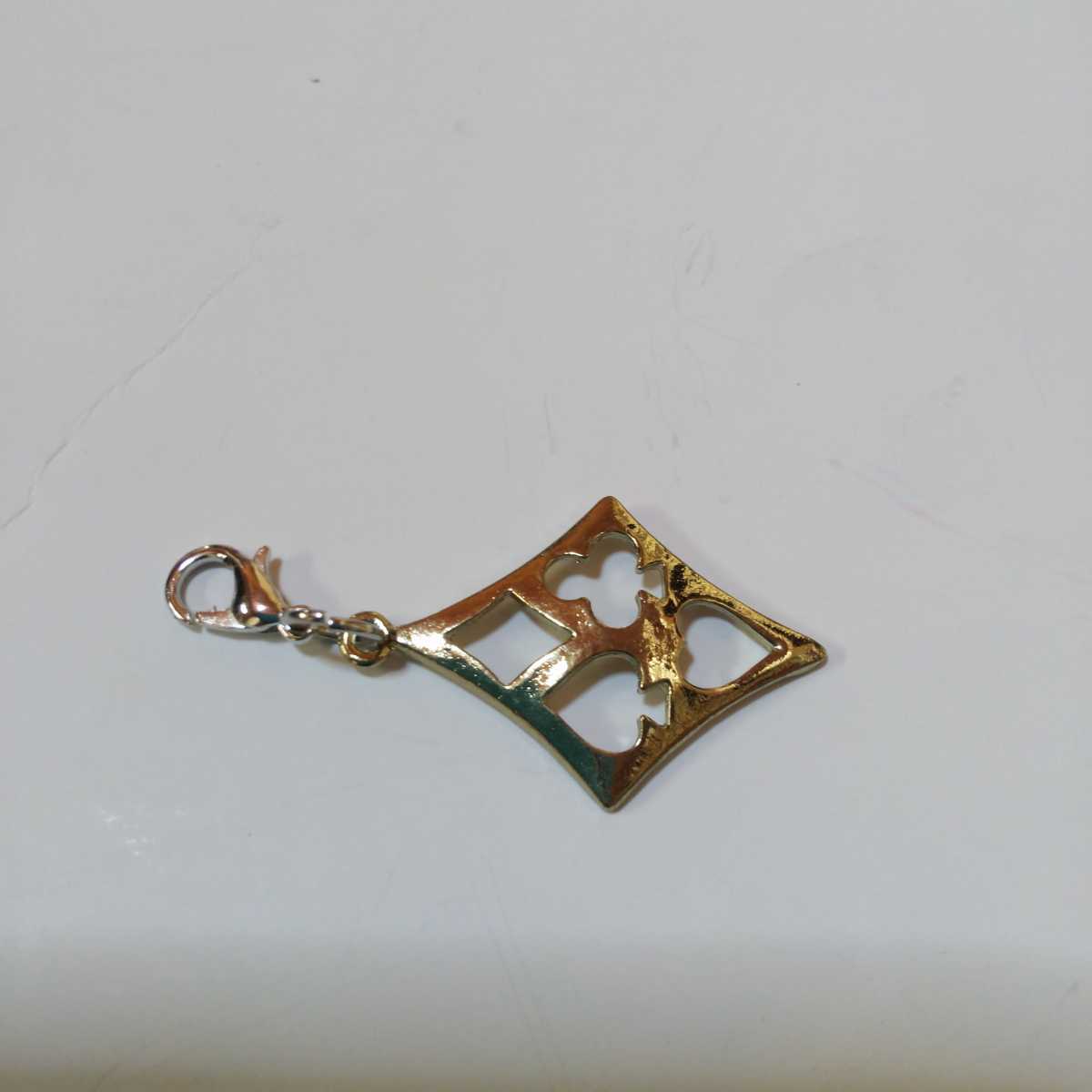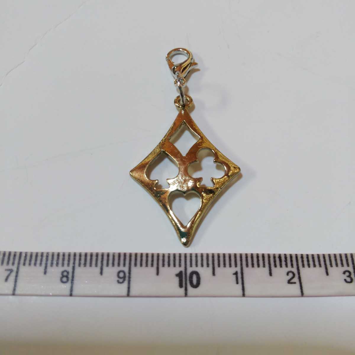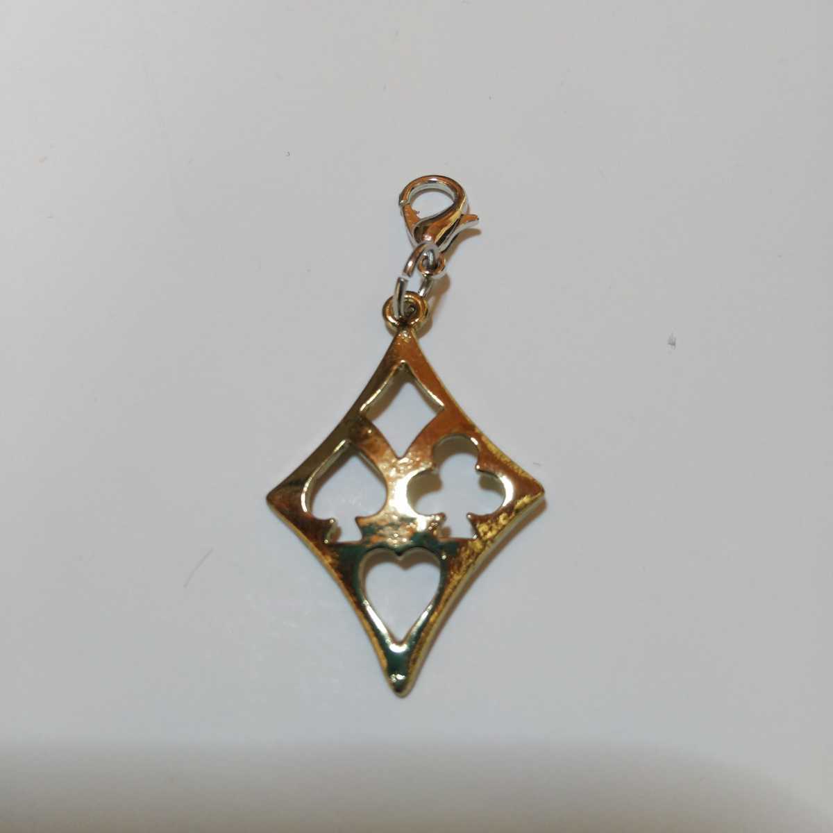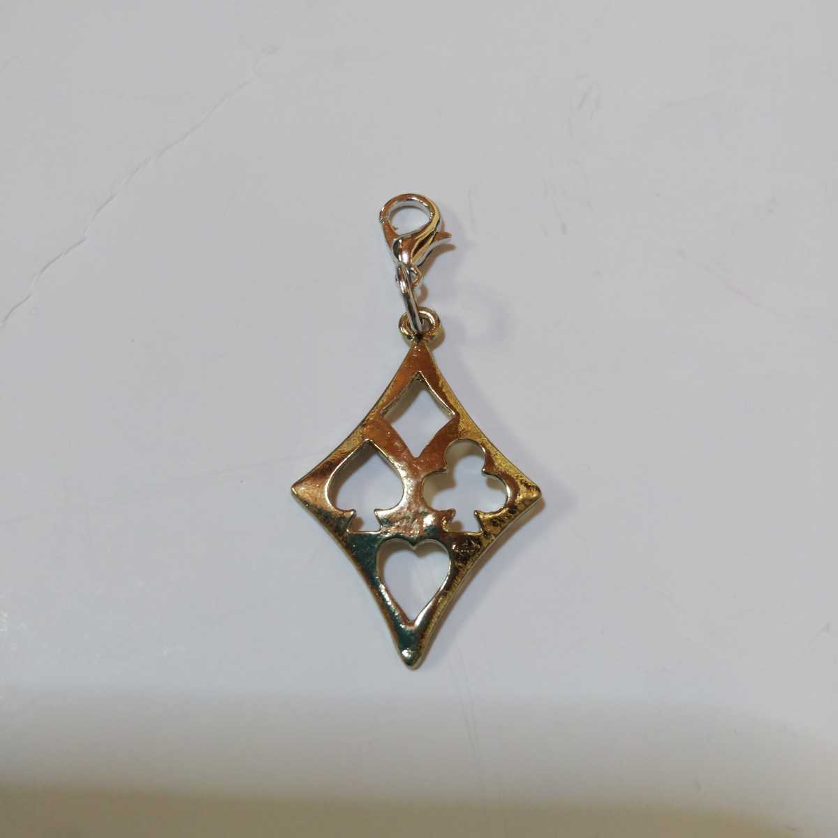トランプモチーフの素敵なチャームです。大き目変形ダイヤ型のフレームから、ダイヤ・スペード・クローバー・ハートの4つが型抜きされたオシャレなデザインです。