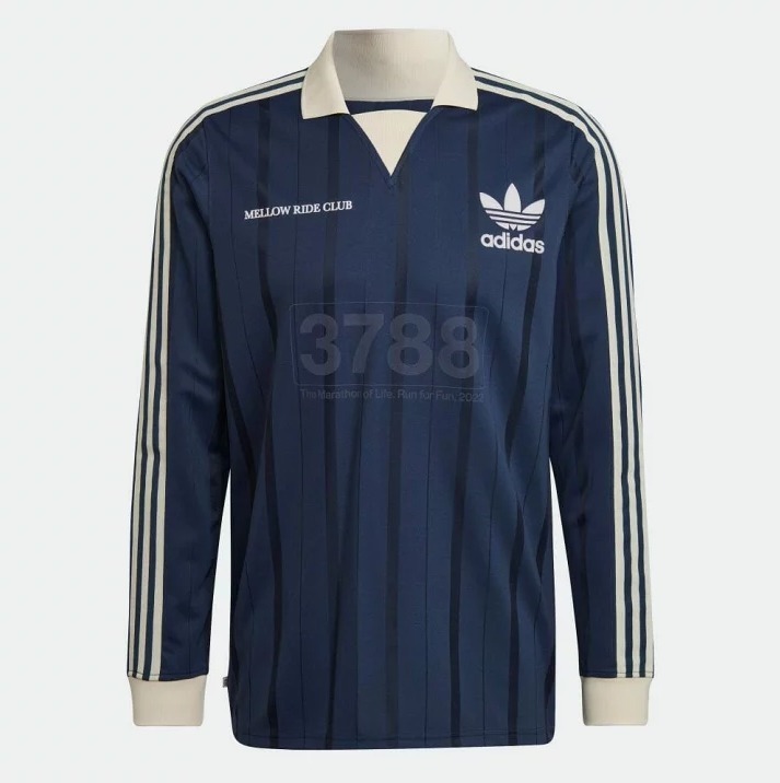 アディダスを象徴するスリーストライプスが入った、長袖シャツの人気は根強い。かつて人気を博したリブ仕上げの袖口、ポロ襟、フロックプリントのディテールが効いた、競技会のゼッケンを思わせるナンバーと文字を薄く入れたジャージー。どの季節でも快適に着られる、とびきりソフトで心地よい素材で作られた、頼れる一枚。