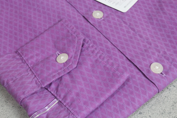 殊プリント加工(濃染プリント)を施した60/-コットンローン素材を使用。パープルは、製品染め加工をすることで、濃淡のついたジオメトリック柄が浮かび上がります。オフホワイトは、製品洗い加工のみにすることで、無地ライクに着回せる柄感に仕上げています。モデルはレギュラーカラーの長袖ロールアップモデル。春先はニットやカットソーとコーディネート、夏はタンクトップの上に羽織感覚でショートパンツとあわせるのも雰囲気があります。