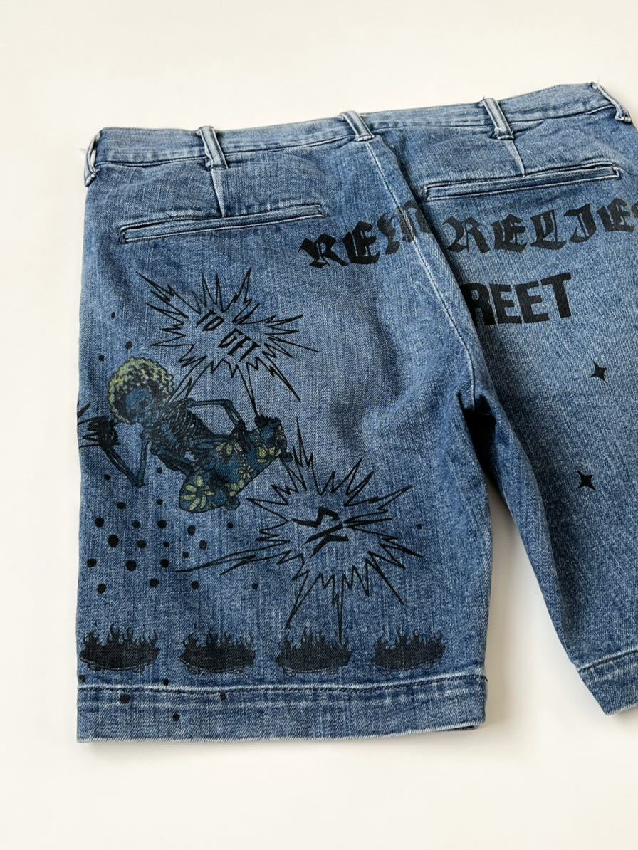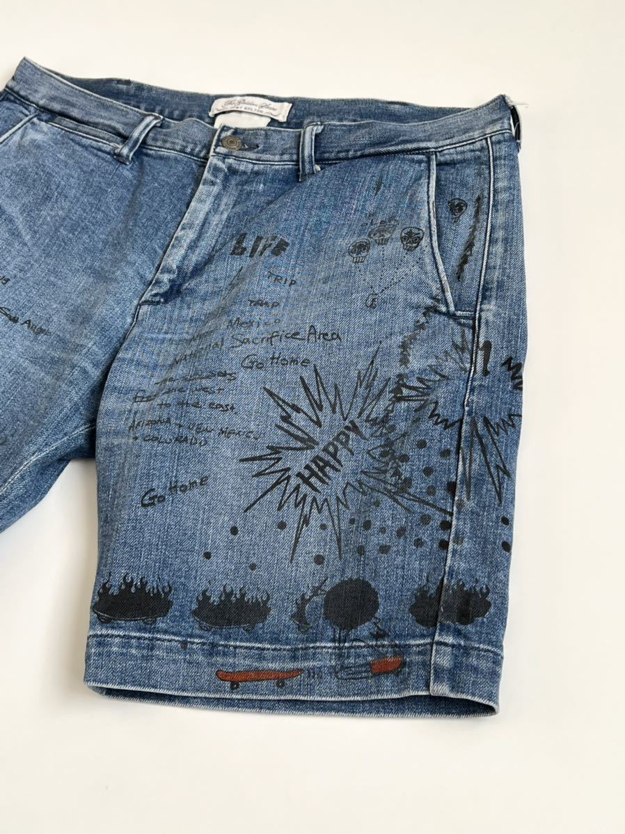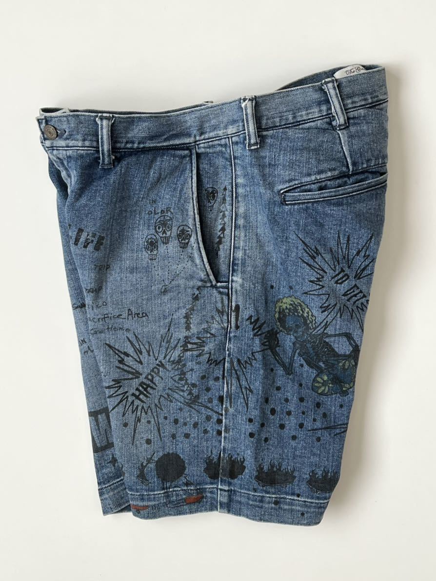 美品★REMI RELIEF 落書き プリント ストレッチ デニム ショーツ L レミレリーフ ショート ハーフ パンツ B'2nd 別注 総柄 スカル
