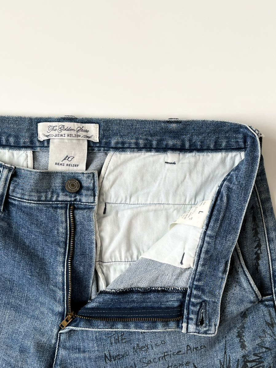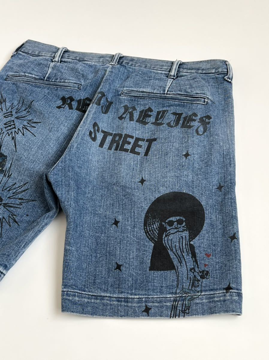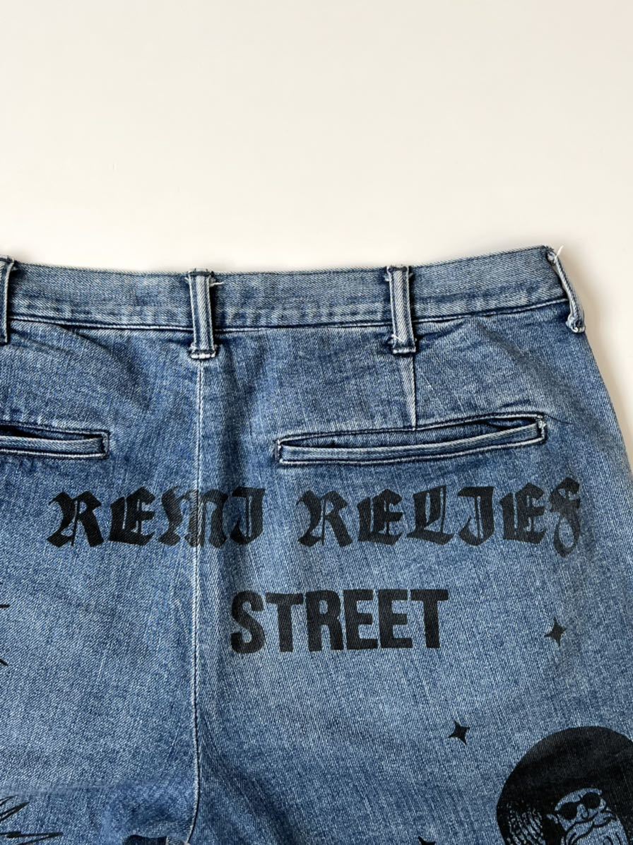 美品★REMI RELIEF 落書き プリント ストレッチ デニム ショーツ L レミレリーフ ショート ハーフ パンツ B'2nd 別注 総柄 スカル