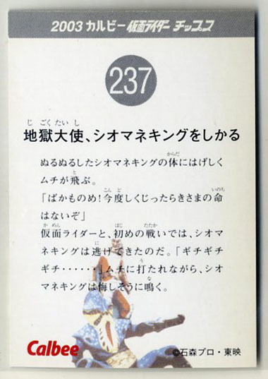 | ◆防水対策 厚紙補強 カルビー 仮面ライダーチップスカード(2003 復刻版) 237番 地獄大使、シオマネキングをしかる トレカ 即決 | |