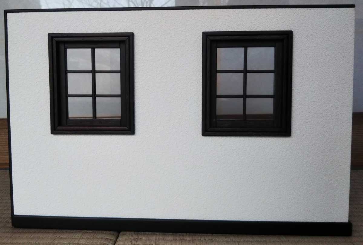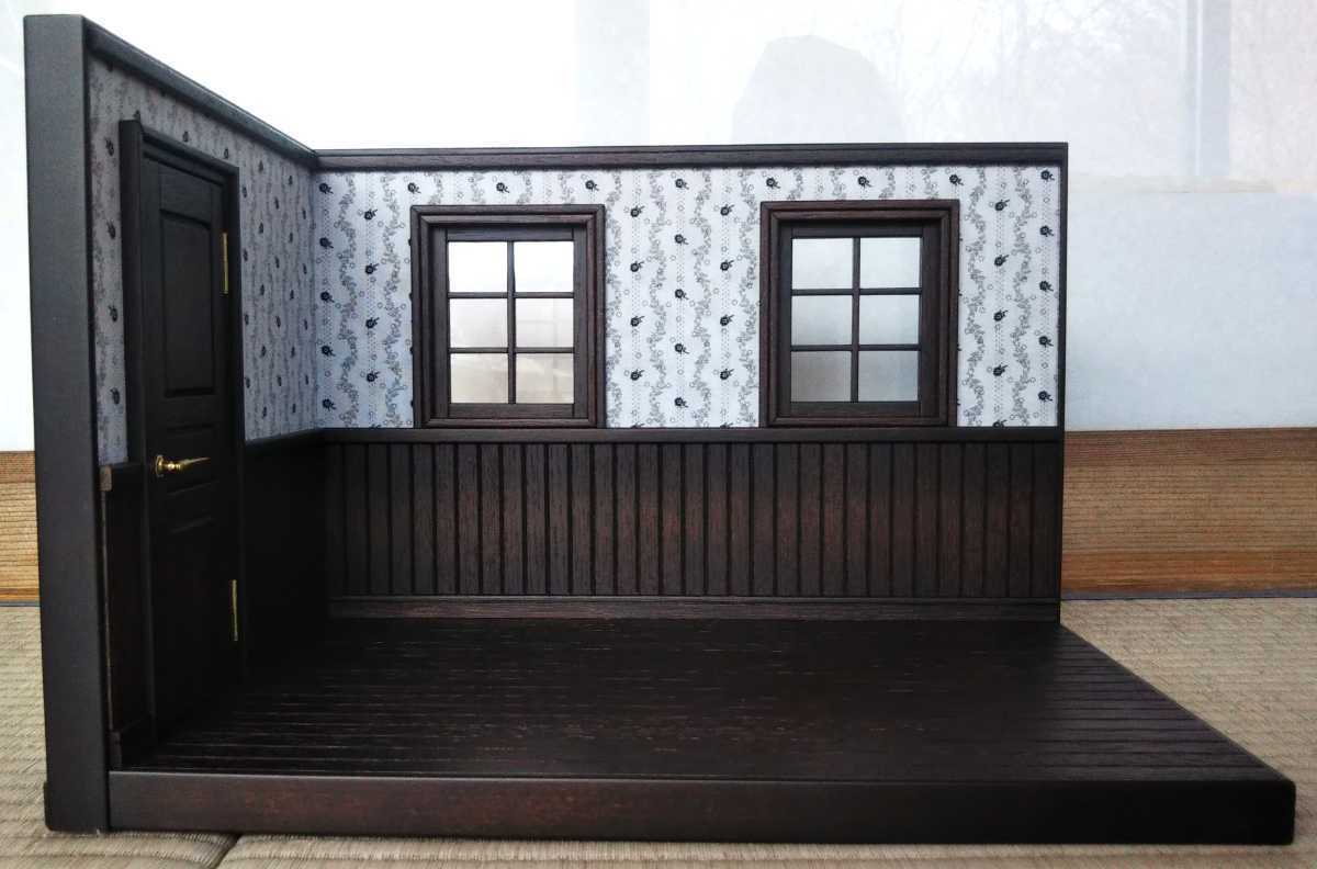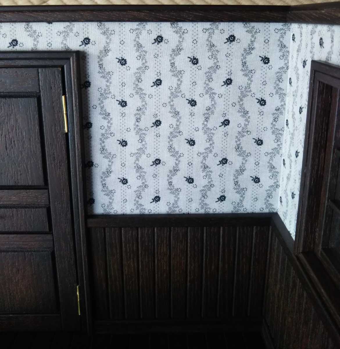 壁紙は内側が布地、外側が一般住宅用のクロス。窓・ドア・腰板・廻り縁・床などは黒茶色着色のクリアラッカー仕上げです。