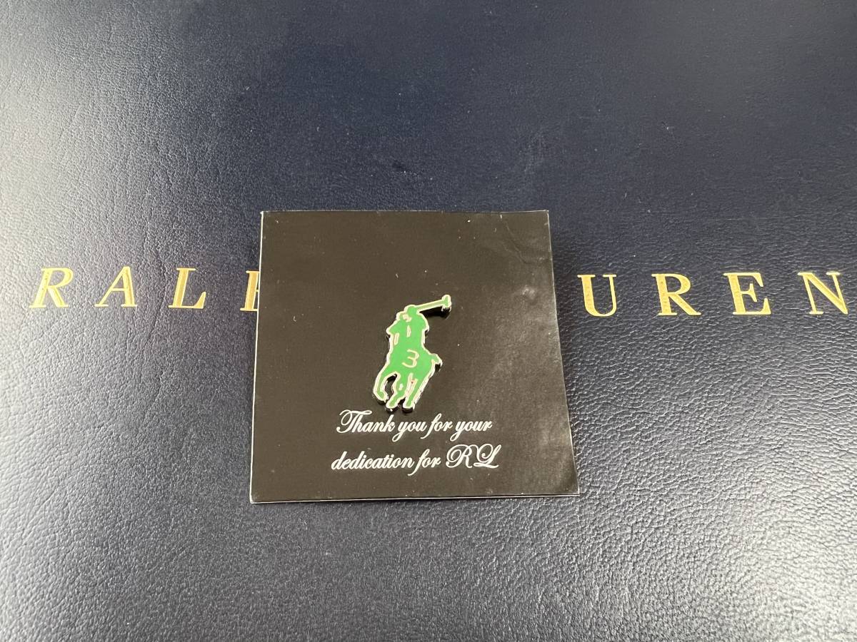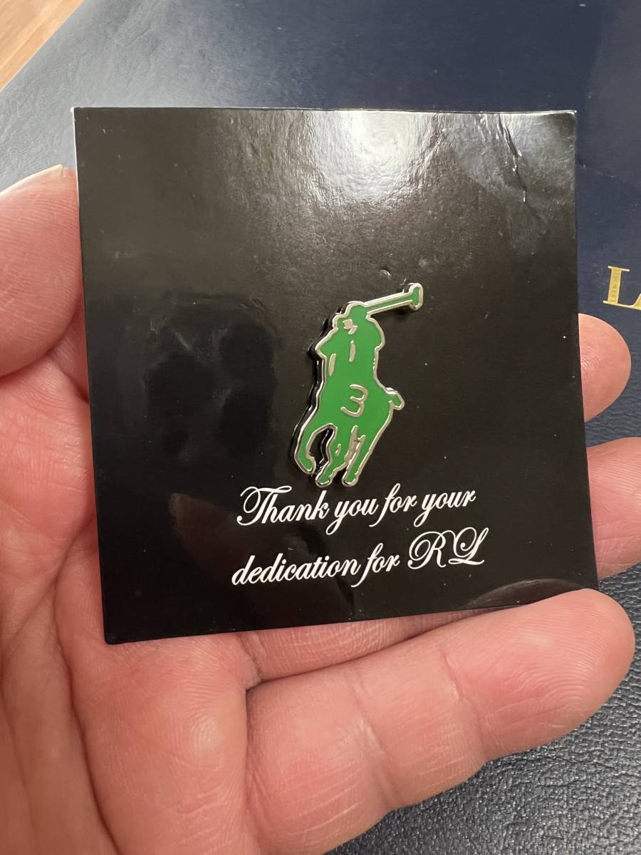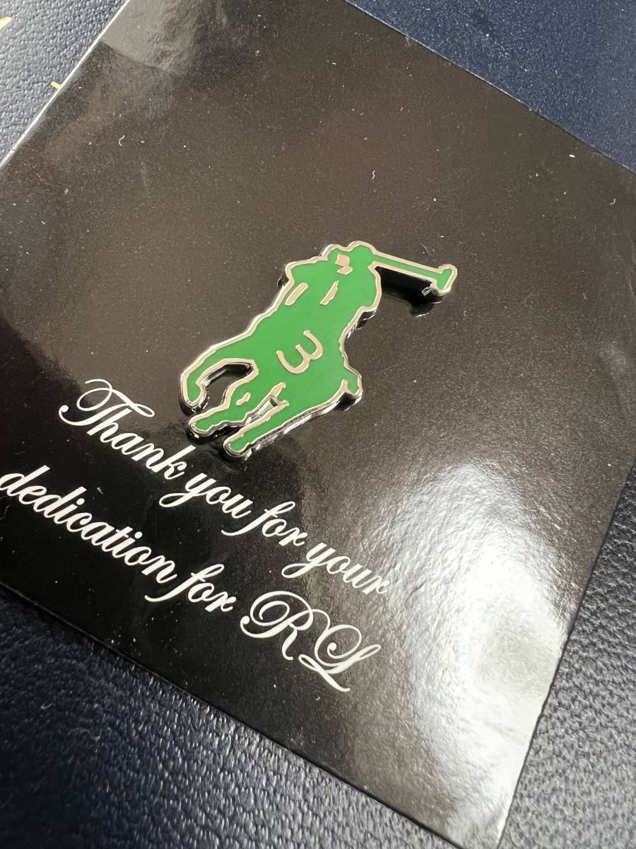 ブランドアイコンのポロポニーを使用した勤続年数を表彰する記念アイテムらしく、七宝焼きされた美しいピンズはオシャレで高級感溢れる珠玉の逸品。