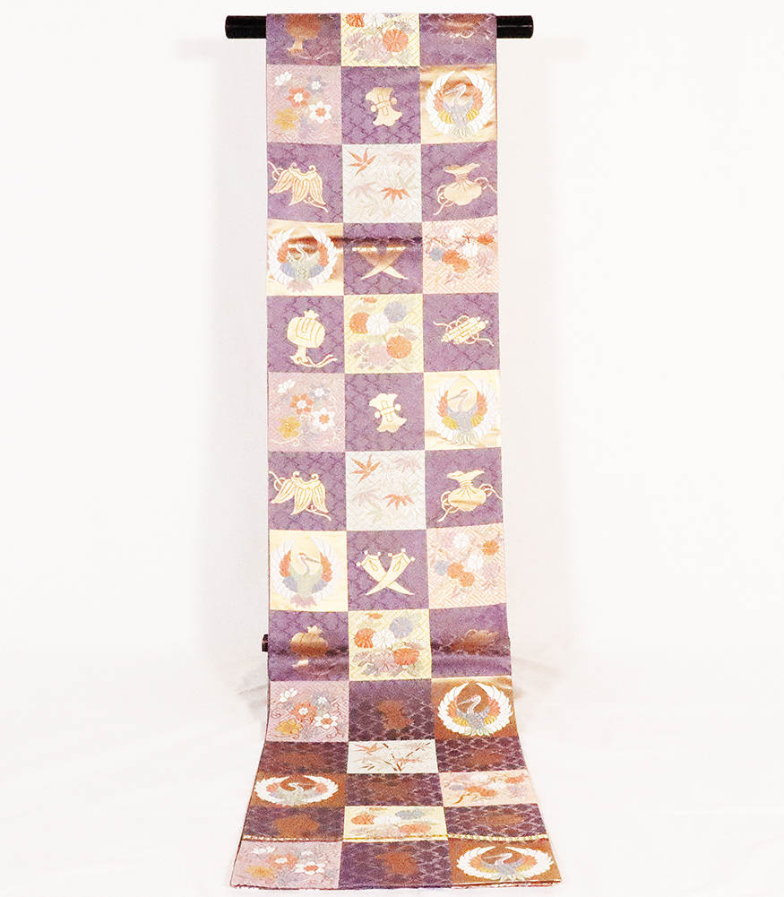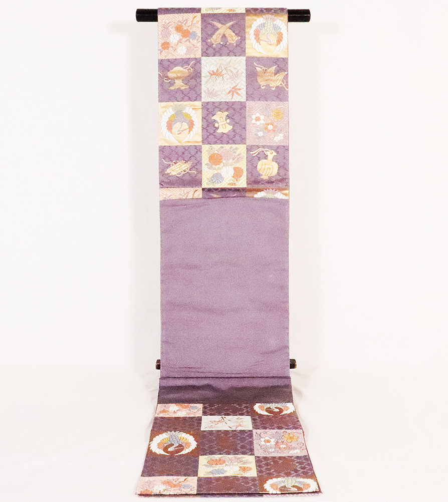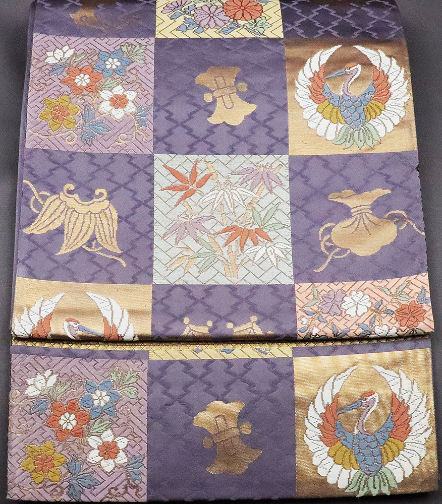 | 西陣織袋帯 紫・グレー・金箔・緑地 宝尽くし・鳳凰・菊・笹・桔梗・格子縞 未使用品 仕立て上がり | |