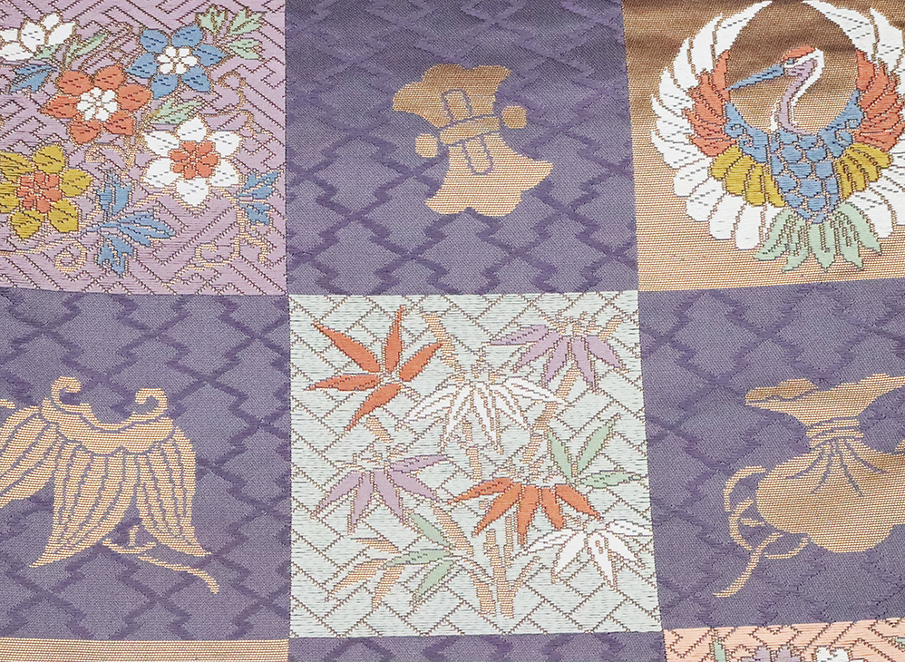 | 色・柄 | 西陣織袋帯 紫・グレー・金箔・緑地 宝尽くし・鳳凰・菊・笹・桔梗・格子縞 (写真では上手く色が出ない場合があります。ご了承下さい) ※お使いのディスプレイの種類や設定の差により 実物の色と画像の色が少々異なることもございます。 写真の枚数が多いので一度パソコンでご覧ください。 |