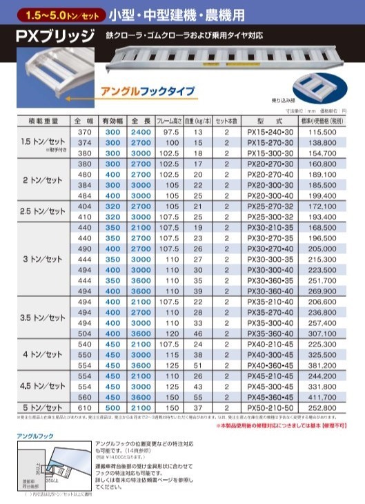 【商品詳細】 名称:PX20-300-30 全幅(mm):384 有効幅(mm):300 全長(mm):3000 フレーム高さ(mm):105 自重(kg/本):22 PXブリッジ アングルフックタイプ2本セットでの積載荷量2トン ●小型・中型建機・農機用 ●鉄クローラ・ゴムクローラおよび乗用タイヤ対応。 ●ステップの台形化を採用し鉄クローラの食込み軽減。 ●高いリブ形状によるステップ防止効果。 ■写真は、イメージです。 メーカーホームページはこちらから日軽金アクト株式会社 こちらの商品は法人様のみ車上渡し元払いになります。 個人様は、運送会社様の営業所止めになります。 ※仕様は予告なく変更になることがございます。 ※下記注意事項の確認をお願いいたします。