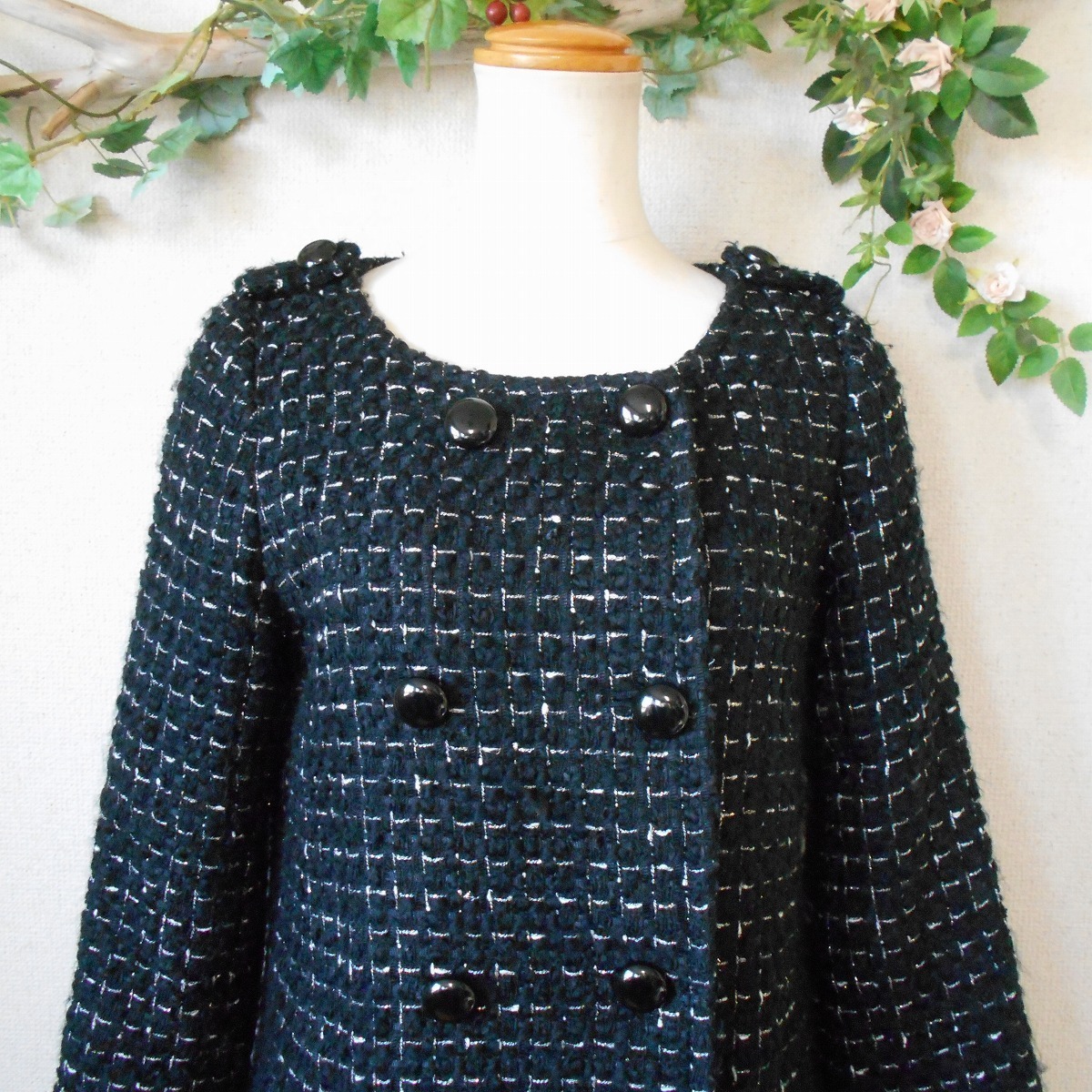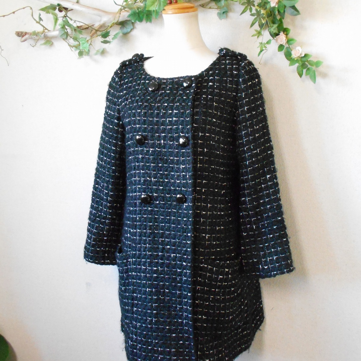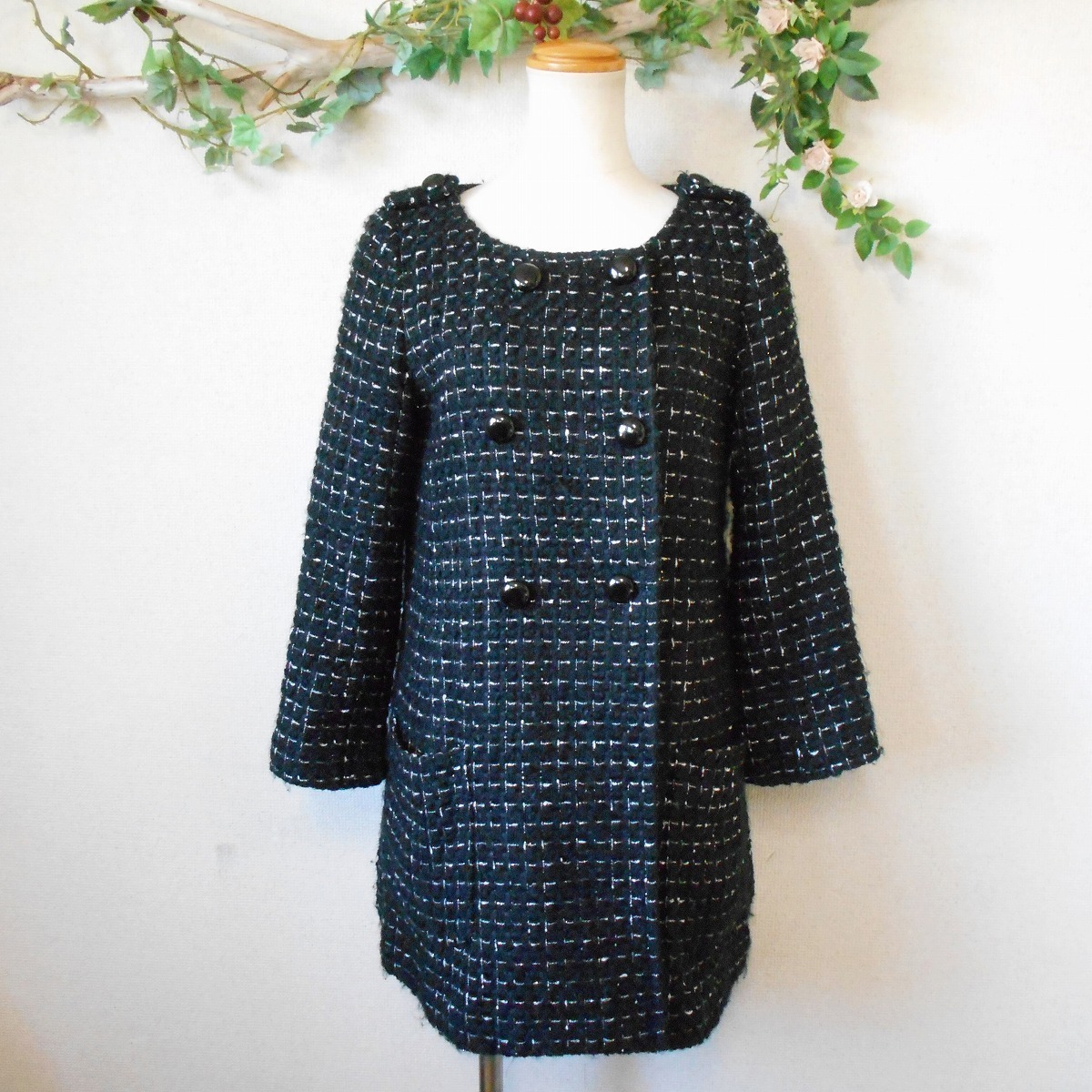 【ポイント】ジルスチュアートのレディース用コートになります。お色は黒色ベースで、柄部分は金ラメ、白、等の糸が使用されています。