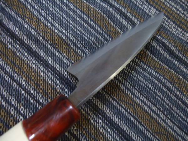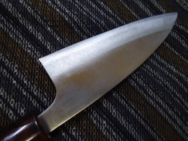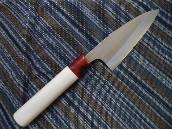 | ご面倒でも必ず注意事項等お読みの上、ご入札下さい。 入札・落札後のお申し出は承れません。 小包丁は大変重宝し、良く切れます! 硬質ステンレス割込み、三層包丁。小魚調理にも重宝 錆びずに切れます! 左近白梅作包丁 両刃 割込 和包丁 さびないこと、切れ味の良いこと、研ぎやすいことこれら全てを充たす 和包丁の極みです。包丁の種類は、用途に応じた厚さに仕上げられています。 サイズ 全長 235mm 刃渡 105mm 刃幅 38mm 刃厚 2mm 重量 69g | |
