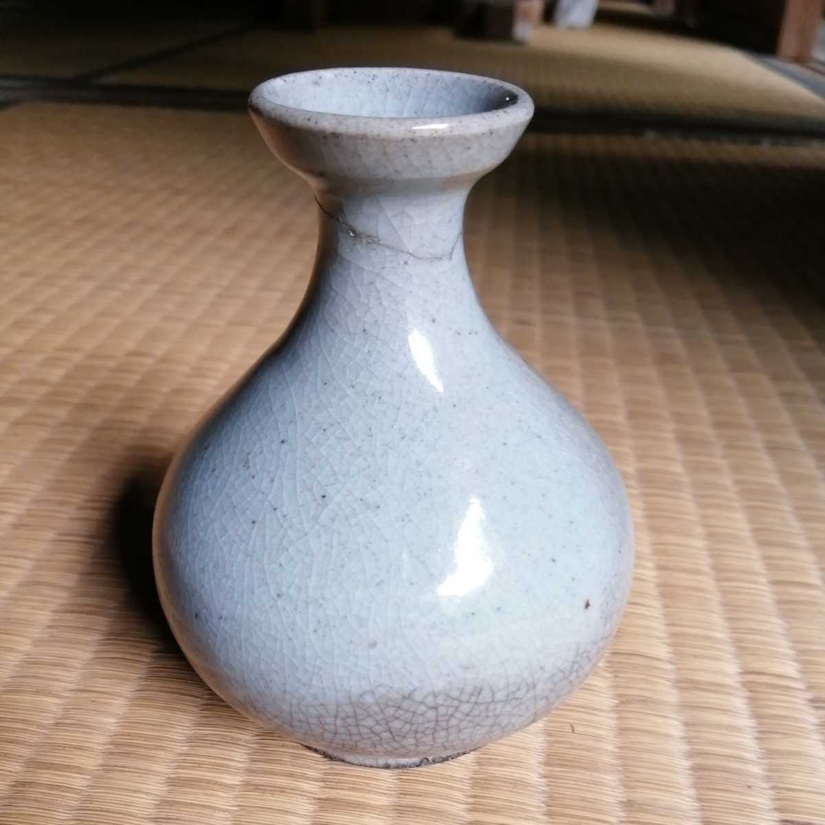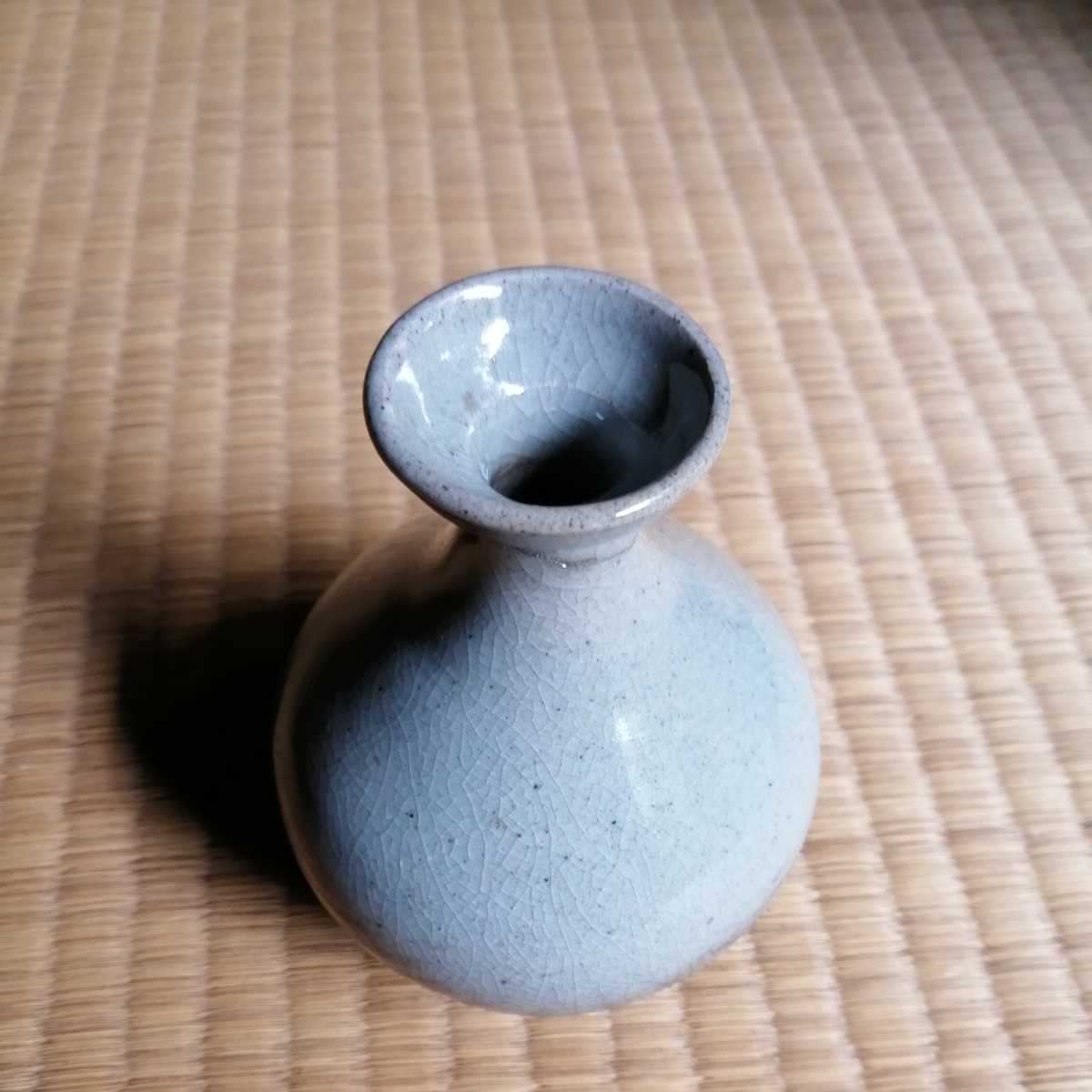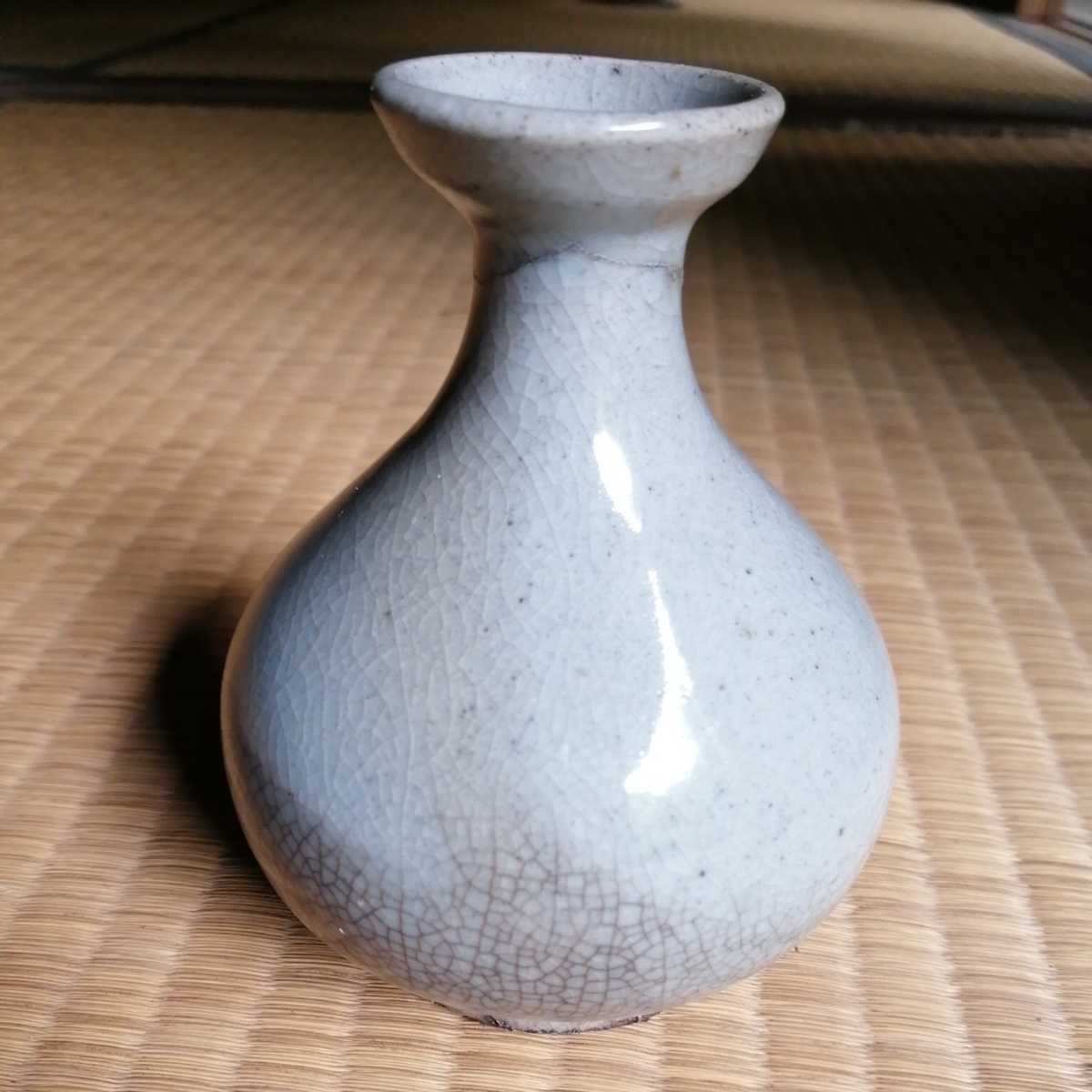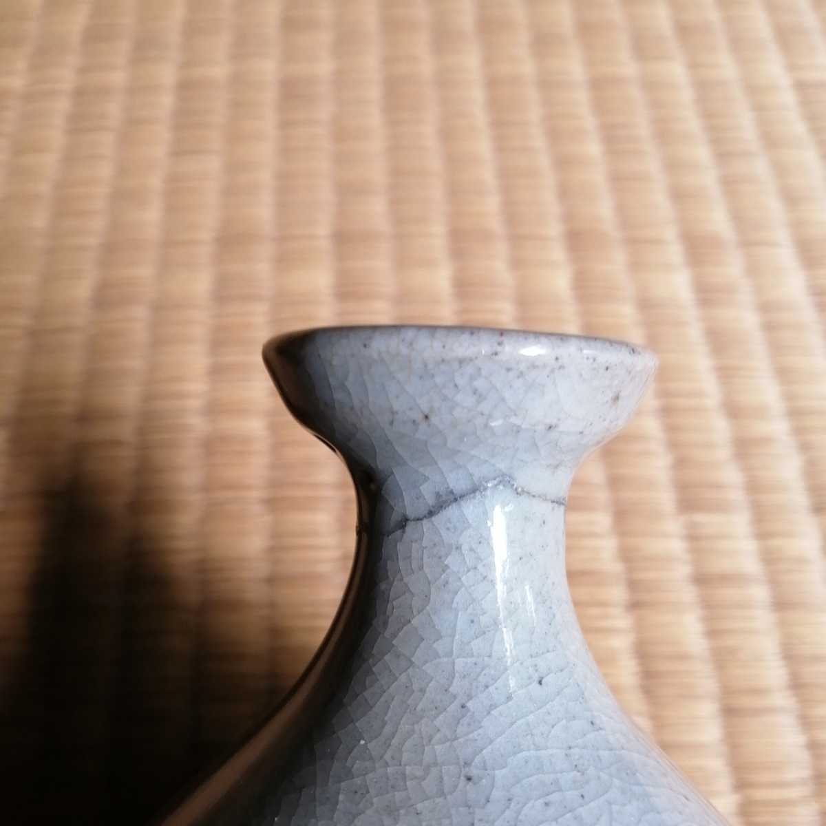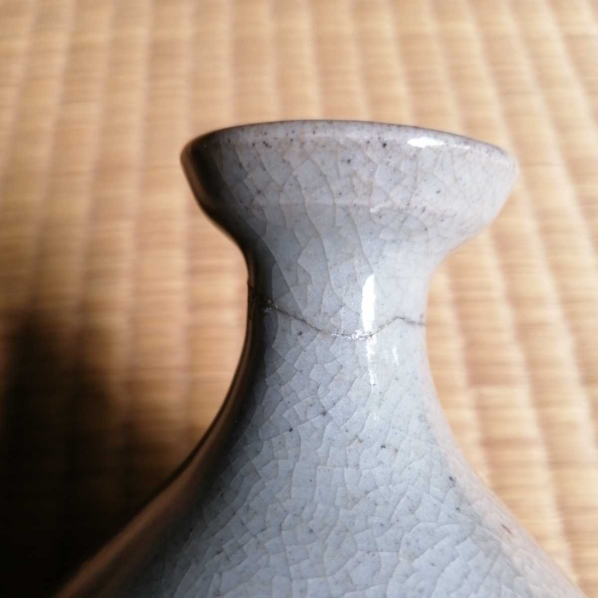 李朝中期の堅手徳利です。貫入が育ったふくよかな胴で、手にすっぽりと収まる器です。首にケガがあり銀直しの形跡があります。