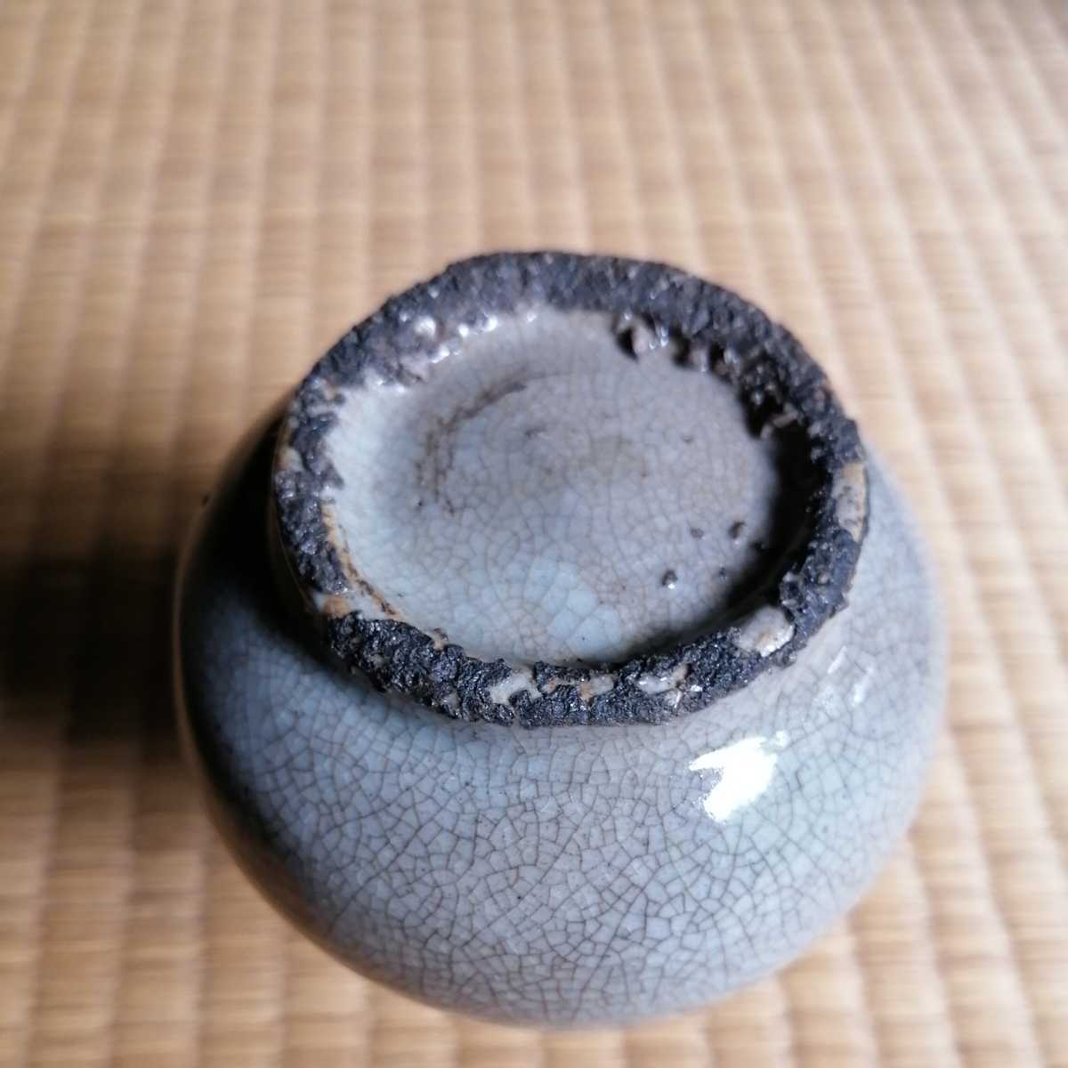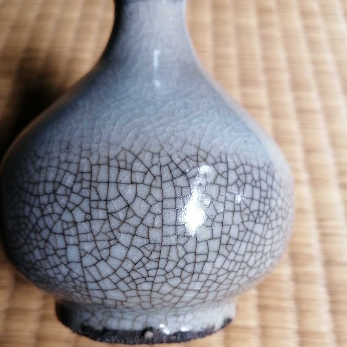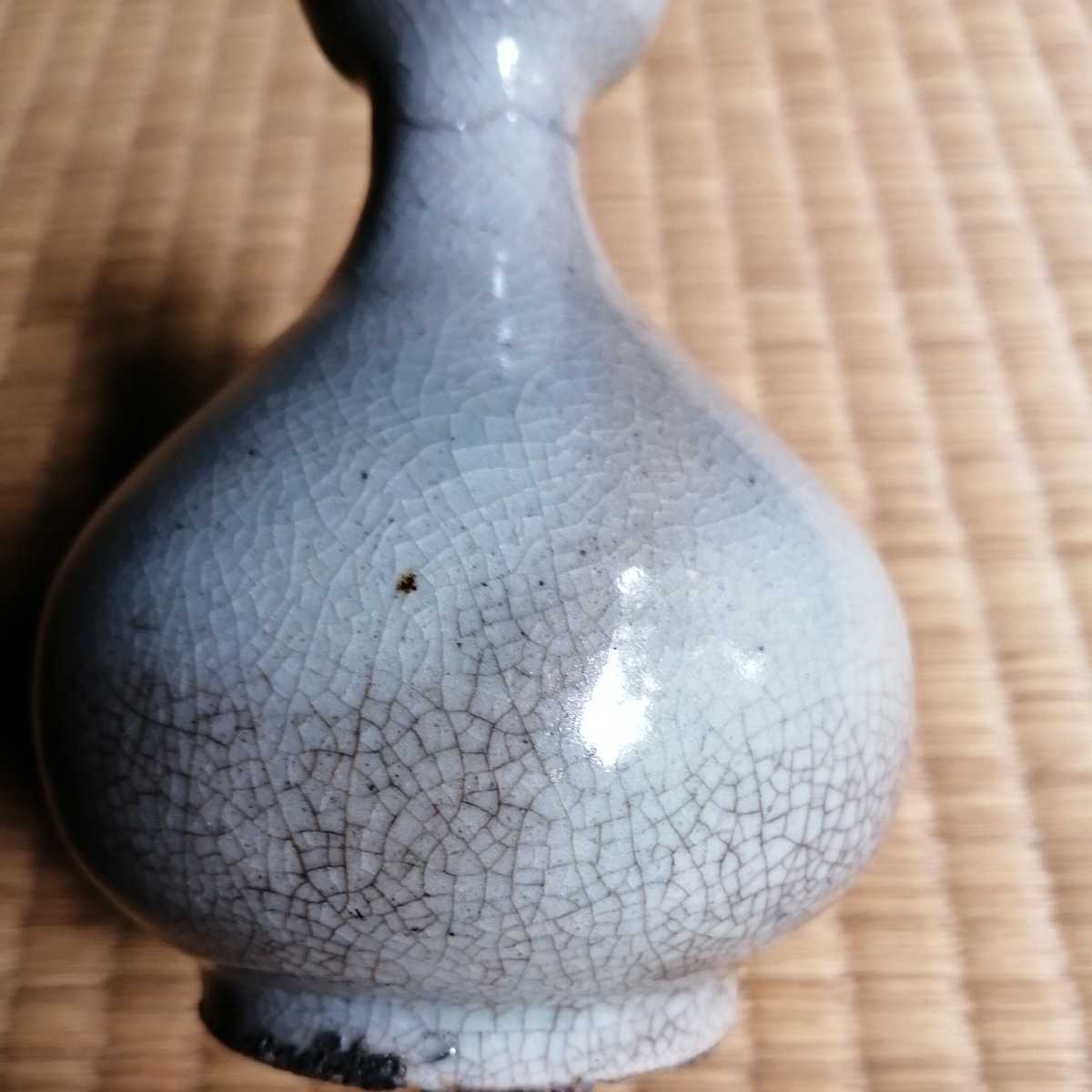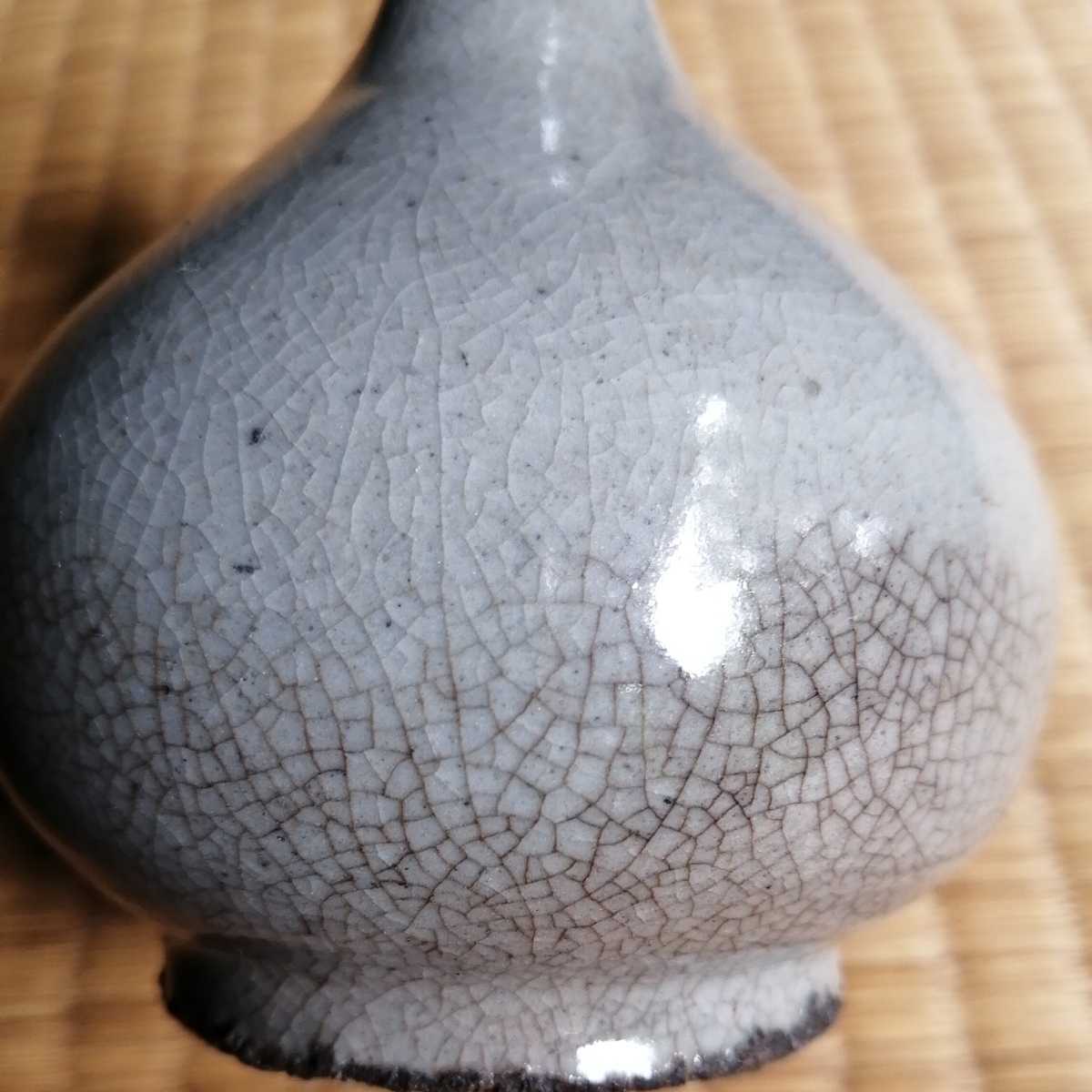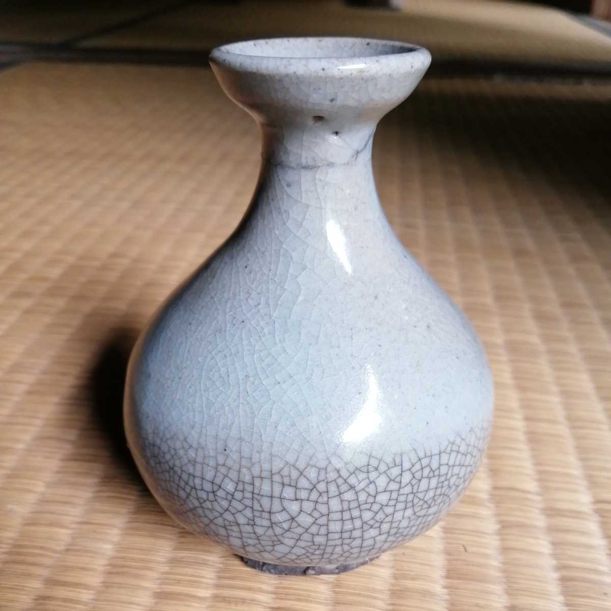 李朝中期の堅手徳利です。貫入が育ったふくよかな胴で、手にすっぽりと収まる器です。首にケガがあり銀直しの形跡があります。