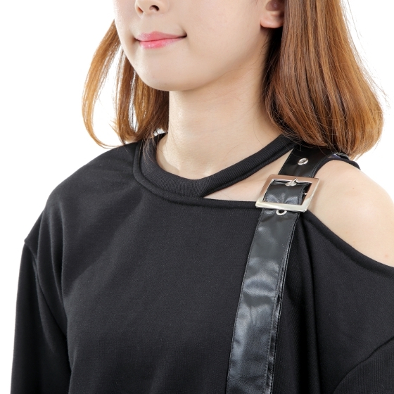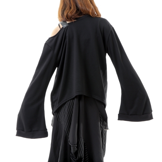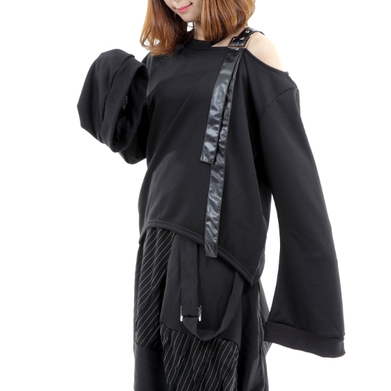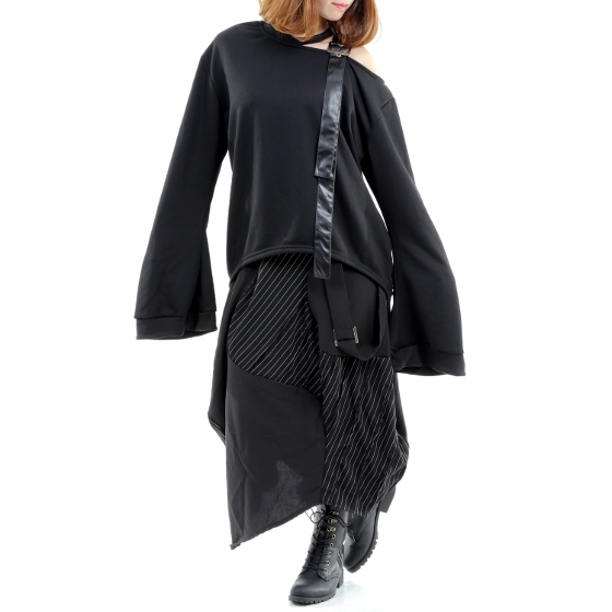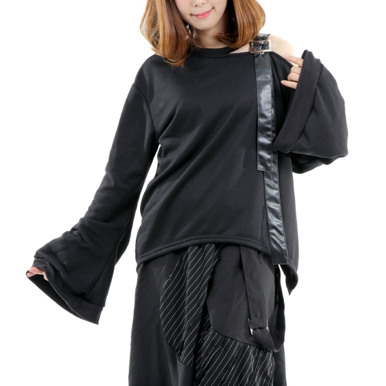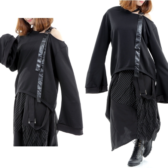 商品説明 | ★オリジナル商品、スウェット素材(ミニ裏毛)ワンショルダーで襟にベルトの装飾、ベルトは合皮です、袖はフレアースリーブで袖が長いです、すそはサイドが長いです。 |